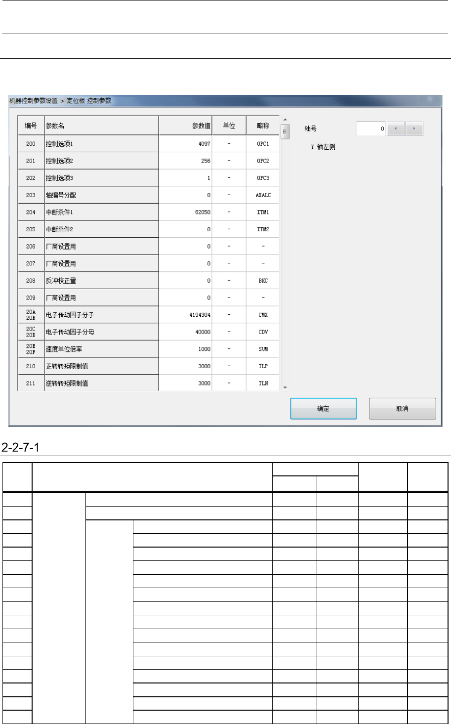 机器控制参数 2- 61 2-2-7 控制参数 如将“轴号”设 置为欲编辑的索引,即可 对所设定的区分中的控制 参数进行编辑。 设置项目 No. 项目 输入范围 单位 备考 最小值 最大值 1 控制参数 面板编号 0 19 轴号 0 19 2 参数名 控制选项 1 3 控制选项 2 4 控制选项 3 5 轴编号 分配 6 中断条件 1 7 中断条件 2 8 厂商设置用 9 厂商设置用 10 反冲校正量 Pulse 11 厂商设置用 12…