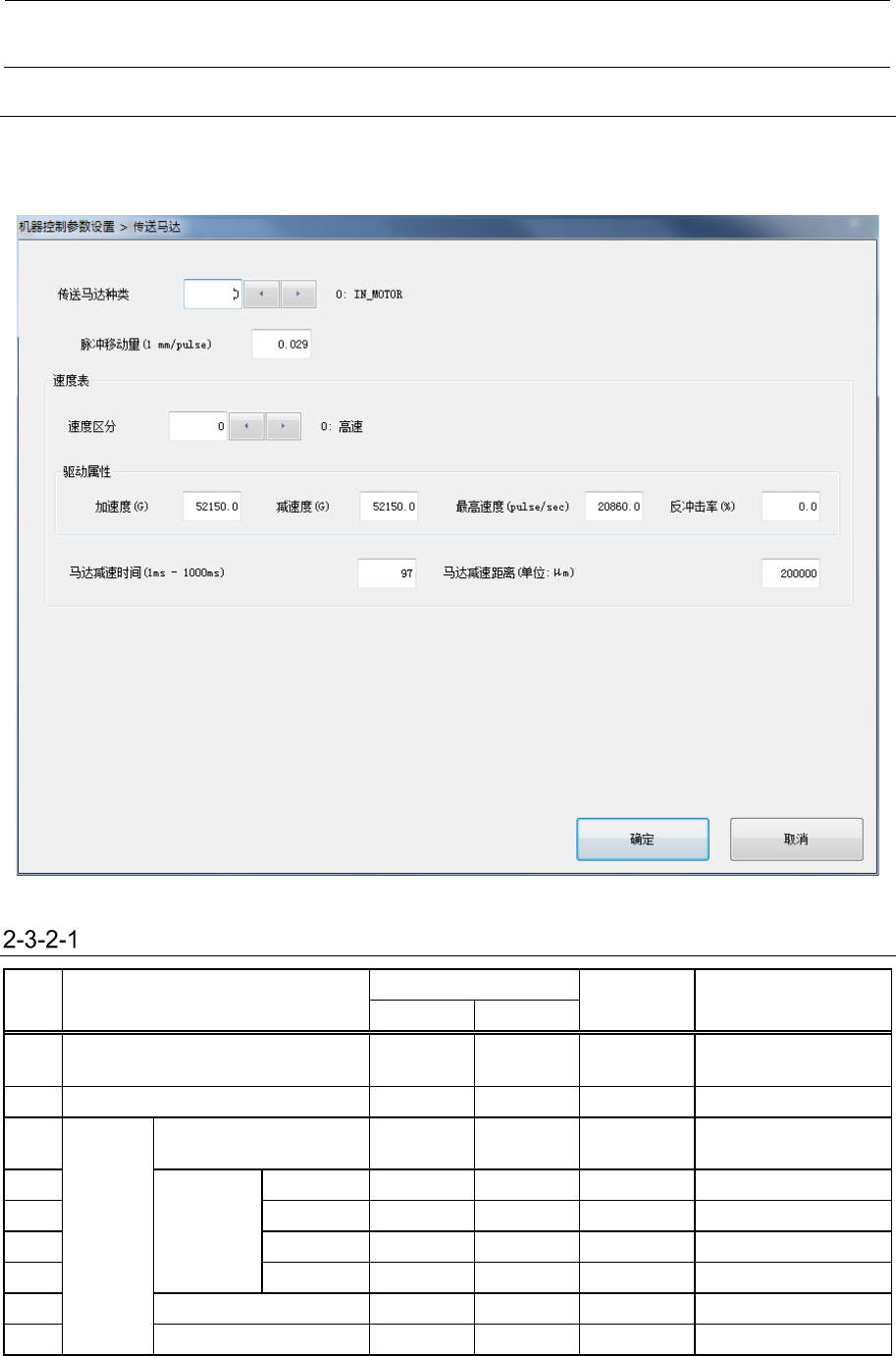机器控制参数 2- 81 2-3-2 传送马达 如将“传送马达 种类”设置为欲编辑的索 引,即可对所设置的 区分的速度表 进行编辑。 并且, 如将速度表的速度 区分设置为欲编 辑的索引, 即可对所设置的区 分的驱动属性进 行编辑。 设置项目 No. 项目 输入范围 单位 备考 最小值 最大值 1 传送马达种类 0 3 参照 2-3-2-2 传送马 达种类 2 脉冲移动量 (1mm/ p u lse) - 100000 0 100000 …