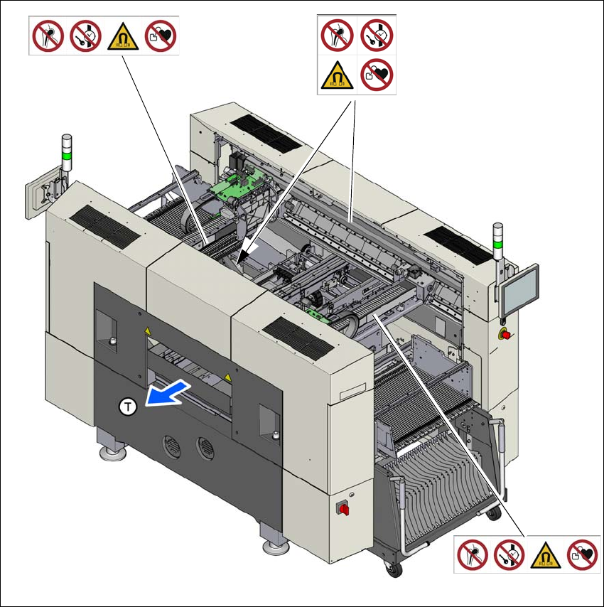 Instruksjonsbok SIPLACE SX1/SX2 u tgave V2 og utgave V3 2 Driftss ikkerhet Fra programvareversjon SR.713.1 Utgave 12/2020 2.2 Varselskilt 47 2.2.5 V arselskilt inne i bestykn ingsautomaten Bilde 2.2 - 5 Varselskilt inne …