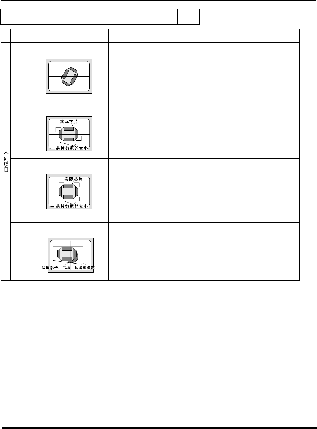 HGR14 附录 1.4 轮廓 识别错误信息 附录 1-93 参考 No. 形状编号 类别 159 1j 壳、透明 樹脂部品 等 1/1 代码 内容 原因 对策 1) 部品角部不是锐 角 请确认对象部品 。 20 (20) 部品角部位置检 测异常 < 错误画面 > 21 (15) 识别角度异常 < 错误画面 > 1) 识别角度超出容 许范围 ± 30 ° 以上 请确认部品高度、 吸着位 置、 吸着 偏移量、 使用…