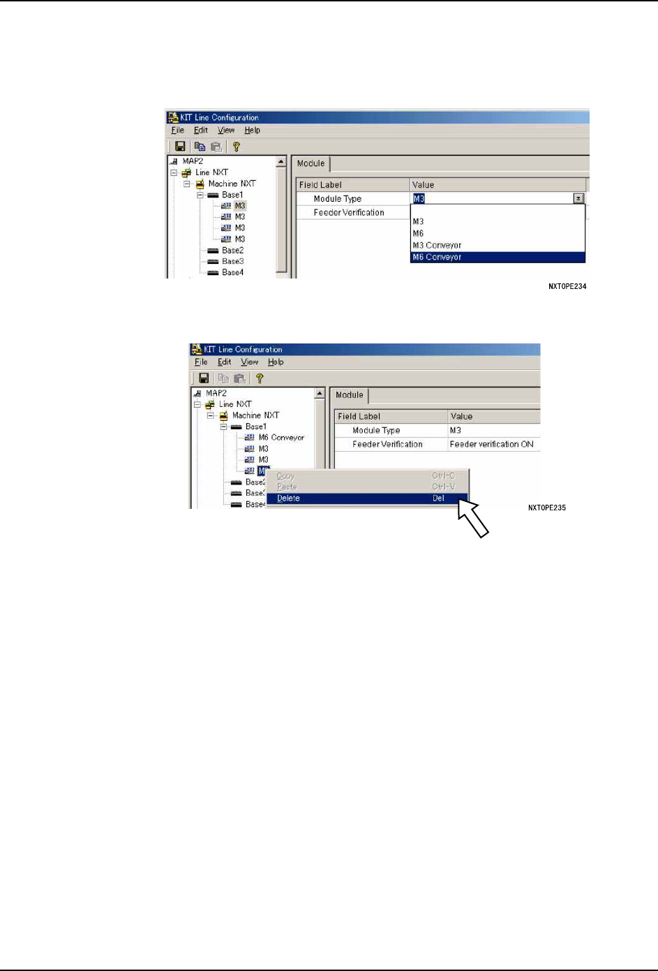 QD027-24 4. 生产 NXT 系统手册 151 · 在 [ 导向器 ] 中选择进行模组搬运轨道设置的机器。接着,请选择 [ 机器编辑 ]- [ 模型标准值设定 ]。 ·请将设置了模组搬运轨道的位 置的 [Mod ule Type] 变 更为 [M6-Co nveyor]。 此时, 如果将 2 台 M3(S) 模组变更为 M6 搬运轨道时,按下 [ 删除 ] 按钮减去 1 台模组, 使之符合实际的模组构成。 Cancel