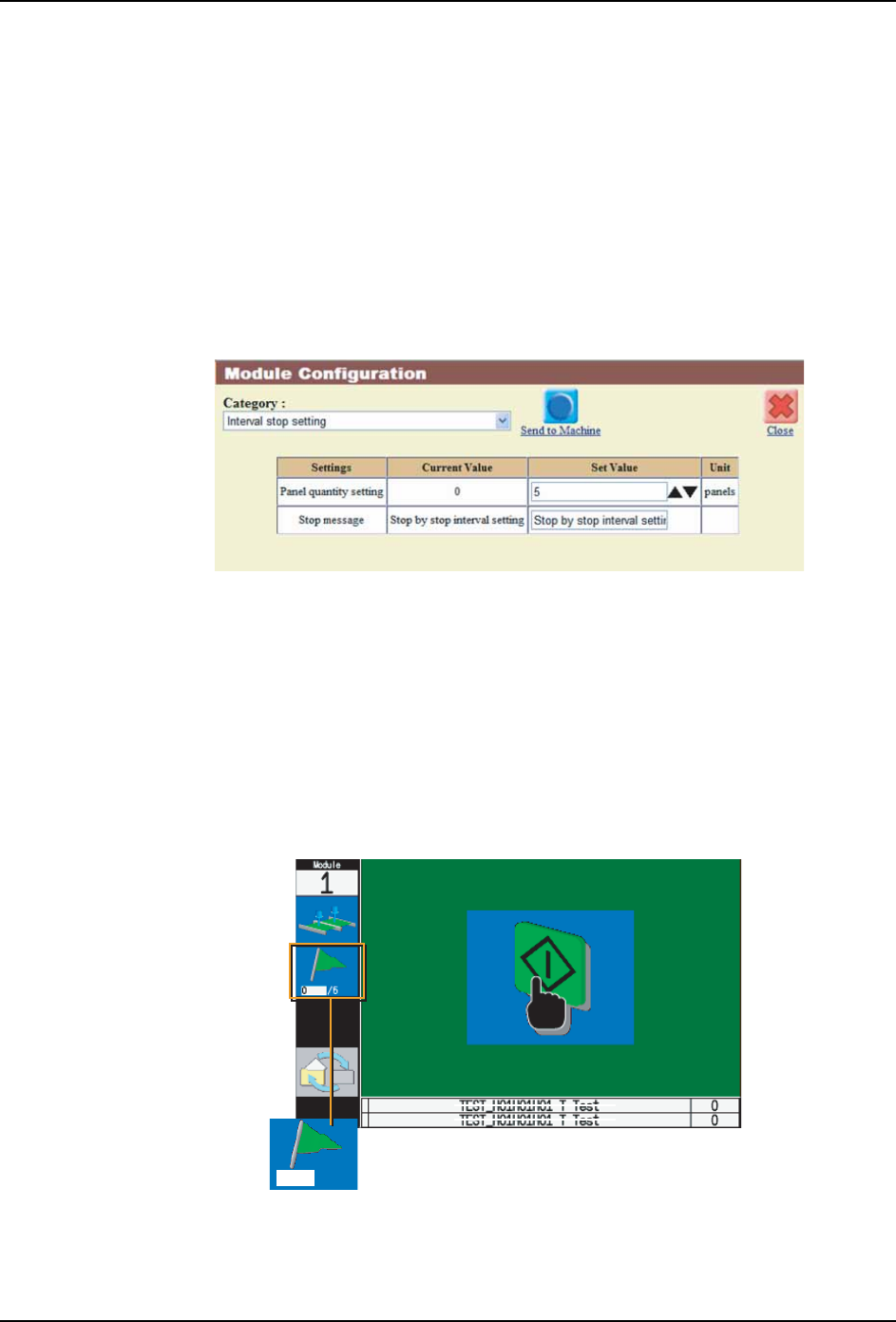 机器在将指定块数的生产电路板送出后周期停止。此时,操作画面上显示出间隔停止向导。