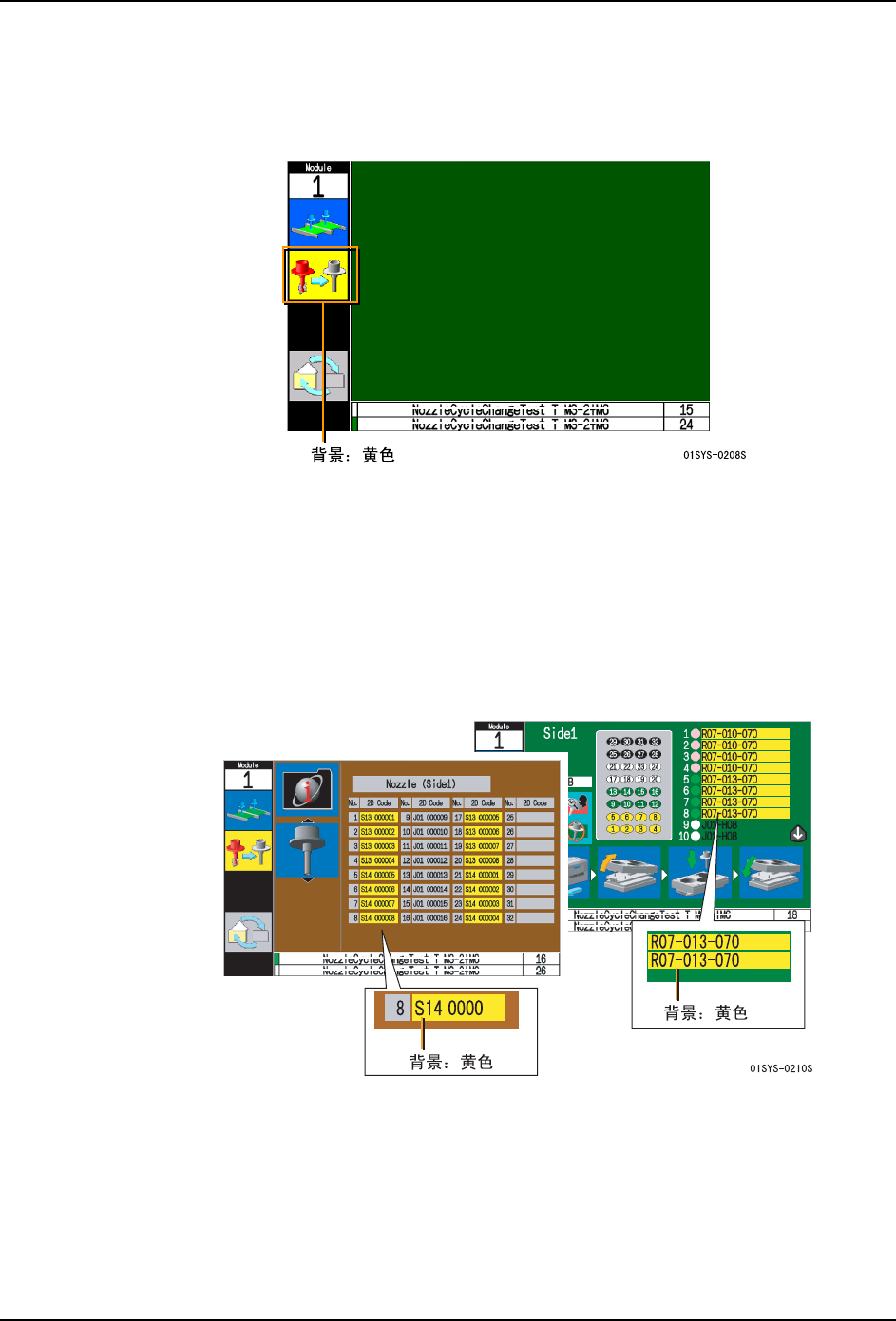 备注 )在手动模式的信息指令及换线时的安装向导中,被切换的吸嘴的代码或别名以黄色的