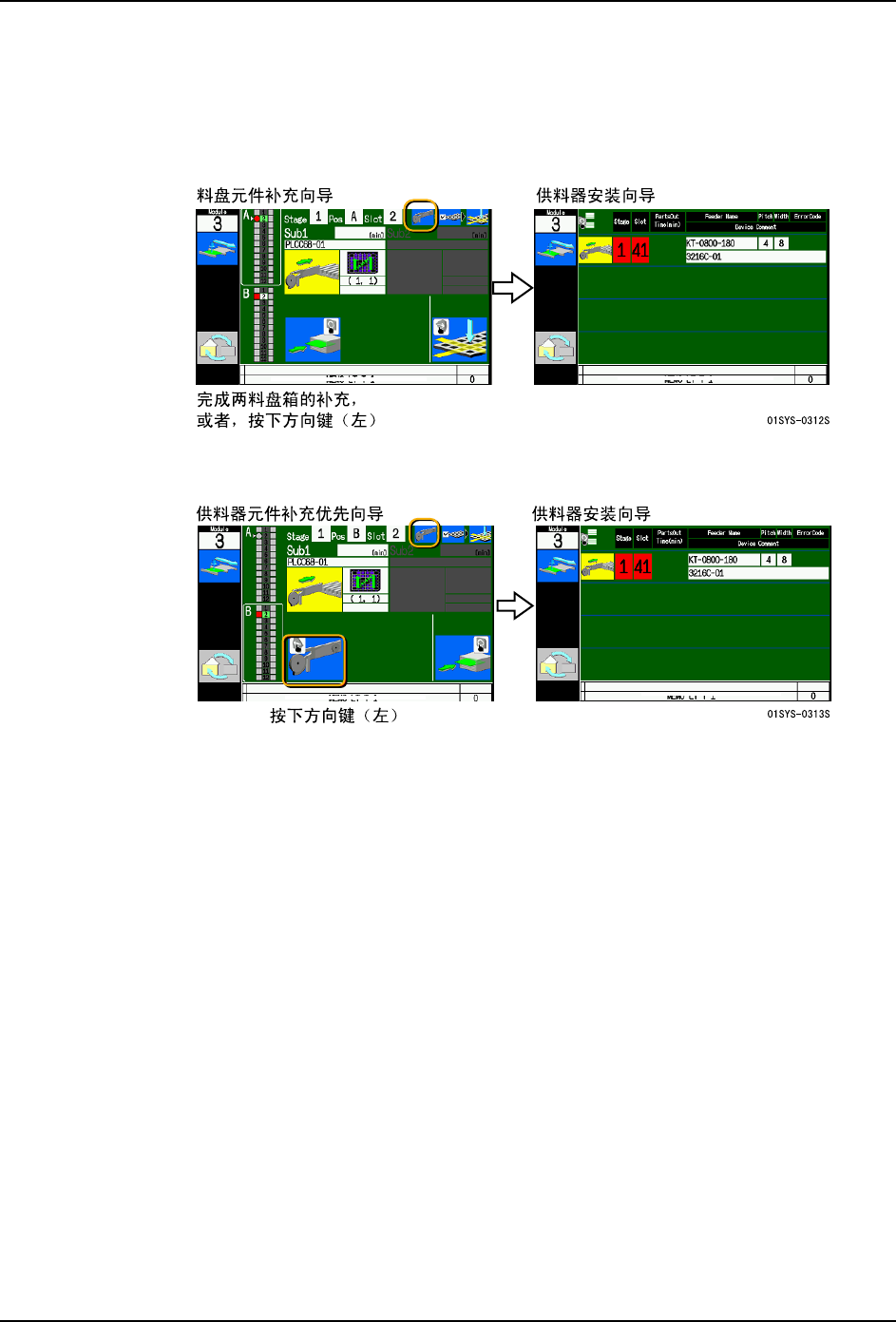 QD027-24 5. 换线 NXT 系统手册 193 5.4.3 连接了料盘单元 -LT 的模组的向导画面 在连接了料盘单元 -LT 的模组中, 需要安装料盘元件和供料器元件的时候, 料盘安装向导被 优先显示。 这时,完成料盘 的安装,或者按下操 作面板的箭头键 (左) ,就会切换到供料器安 装向导。 当补充了上下料盘箱中的一个, 变得能够生产时, 供料器元件优先补充的向导画面就会被显 示。这时,请按下操作面板的箭 头键 (左) ,切…