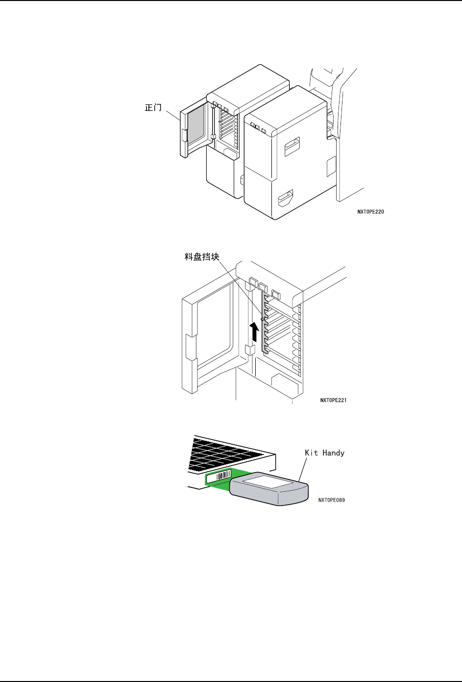 5. 换线 QD027-24 220 NXT 系统手册 5.7.2 料盘的安装步骤 ( Verify ON 时) 1. 打开料盘单元 -M 的正门。 2. 请提起料盘挡块。 3. 使 用 KIT Handy ,进行新料盘的验证 检查。 a. 在 KIT Han dy 画面上选 择补充对象的料站。 b. 使 用 KIT Hand y 进行元件条 形码或者 DID 的扫描 。 备注 )关于料盘的验证检查, 请参照 [Fujitrax Ver…