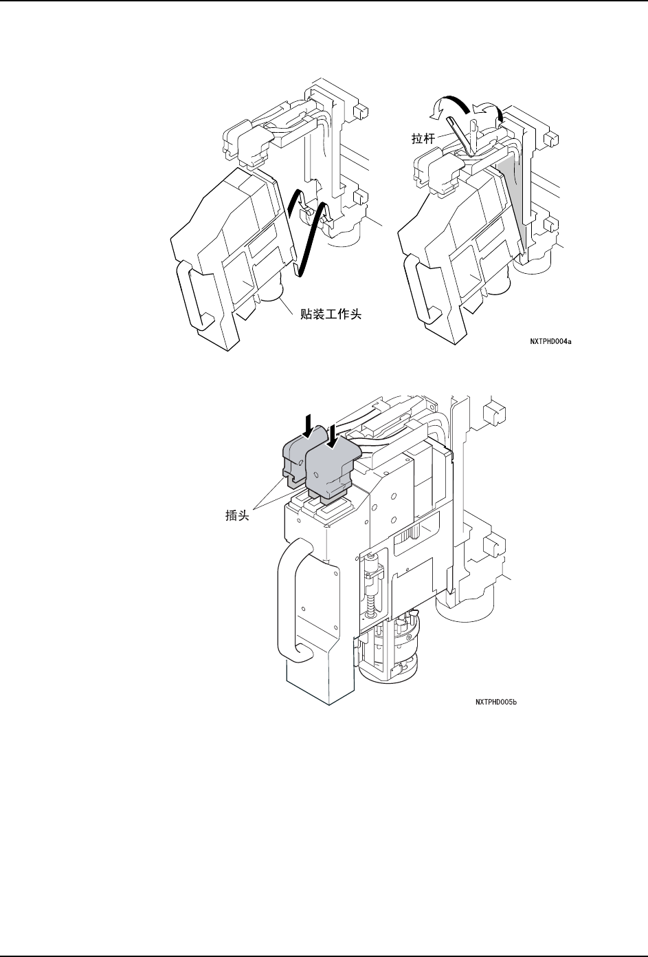 5. 换线 QD027-24 248 NXT 系统手册 3. 拉起拉杆向左方倾斜。握住手柄,将贴装工作头如图所示前倾后拆下。这时 ,请注意工 作头不要与周围的部件发生干涉 。 备注 )请将拆 下来的工作头放置到选项的工作 头维修保养平台上或者横 置于工作台上使得吸 嘴不弯曲。 注意 在 M6S 模组中进行作业时 , 请不要将贴装工作头靠近 Y 坐标方向的轴。线 性马达所产生的磁性有可能使贴 装工作头或轴受到损伤。另外,在 安装 / 拆卸…