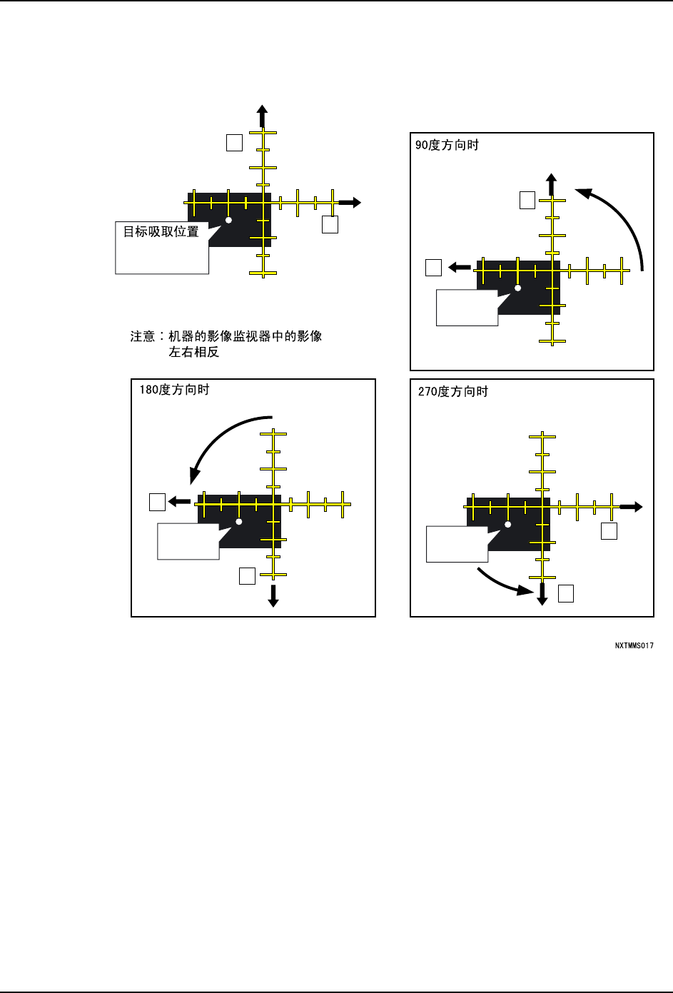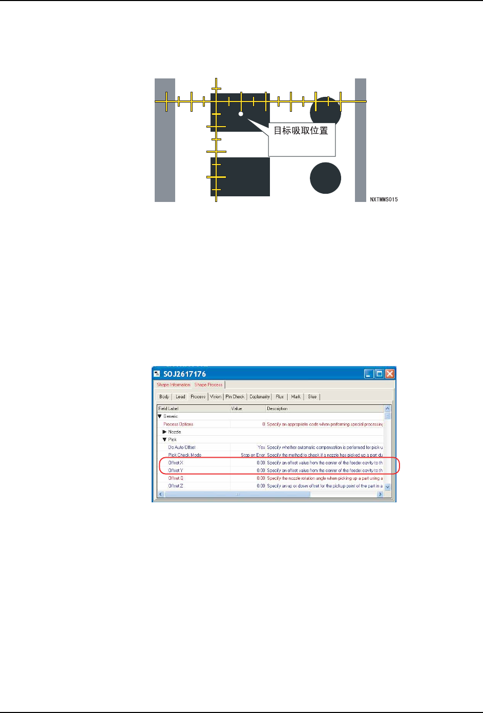 从吸取位置确认的结果中进行 Job 的吸取修正量设定。以下图所示的吸取位置的修正量为例