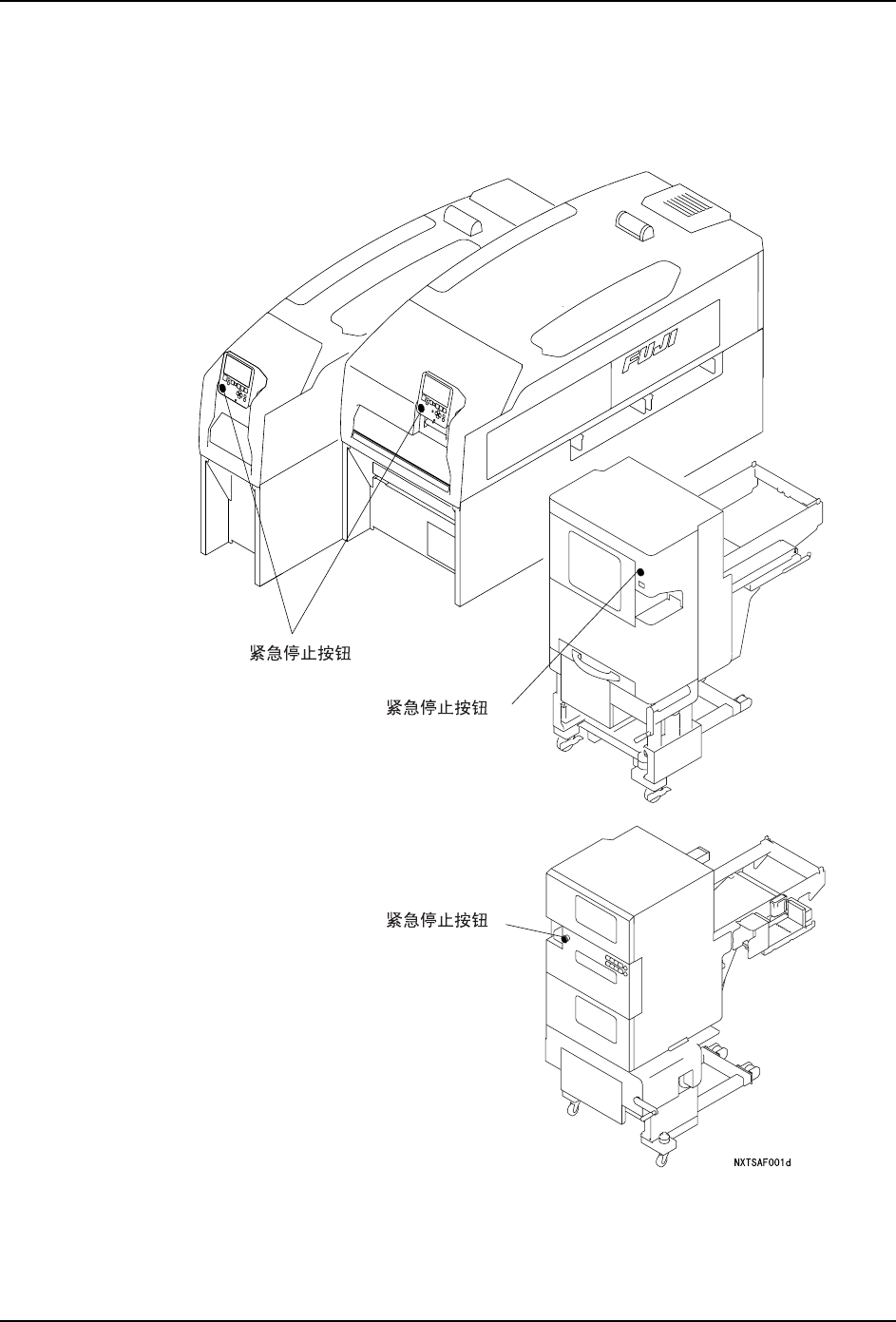 发生紧急情况时,请按下机器上红色的紧急停止按钮停止机器运转。紧急停止按钮的位置请