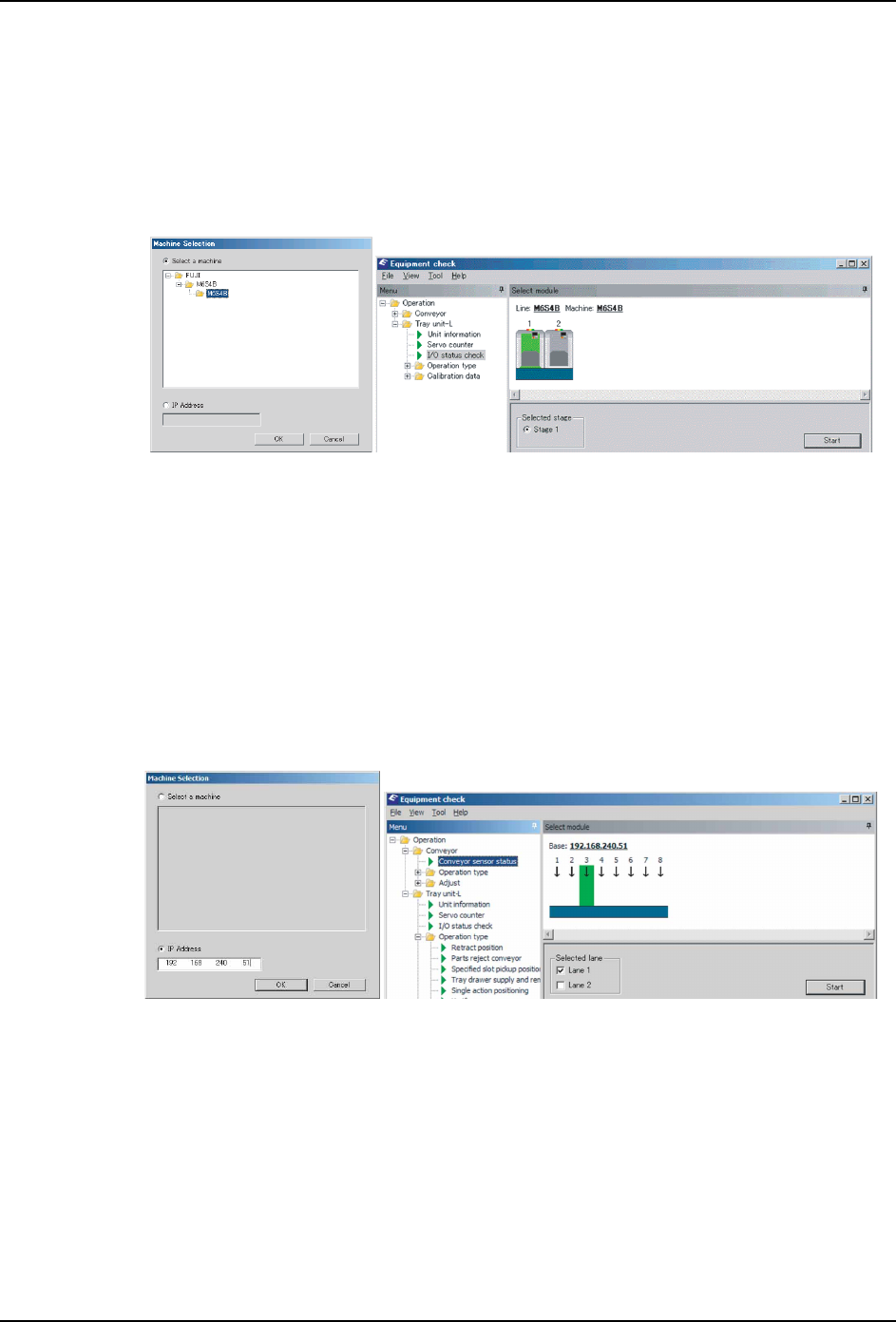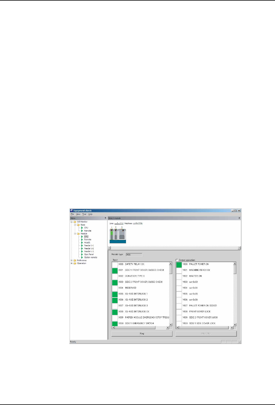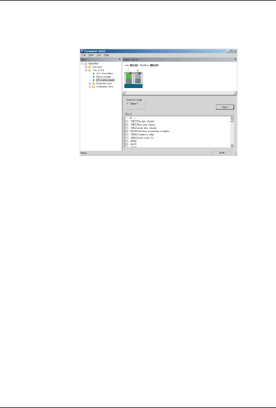 8. NXT 软件工具 QD027-24 344 NXT 系统手册 8.11.2 生产线上的机器的确认 当生产线上发生故障, 现场进行恢复作业的时候, 通过现场使用着的 PC 启动 Equipment Check,进行 机器的确认。 首先,在 [ 机器选择 对话框 ] 内选择对 象机器。接着,从 Equ ipCheck 窗口的 [ 模组选择 ] 框内选择进行操作的模组, 进行 " 8.11.4 通过传感器、 I/O 确认故障的…