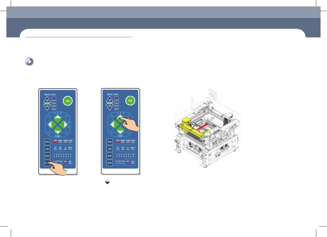 Chap ter 1 本部分介绍设备维护作业环境、作业工具、维修项目等。 维护条件 Advanced Chip Shooter DE CAN S 2 Ma in ten a nc e Ha nd b oo k 1-6 维护前共同执行程序 维护条件 6. Rear X Frame 前 面移动 1. 按 'MO DE' 按钮 按 'JOG' 按钮 2. 按 'A X I S ' 按…