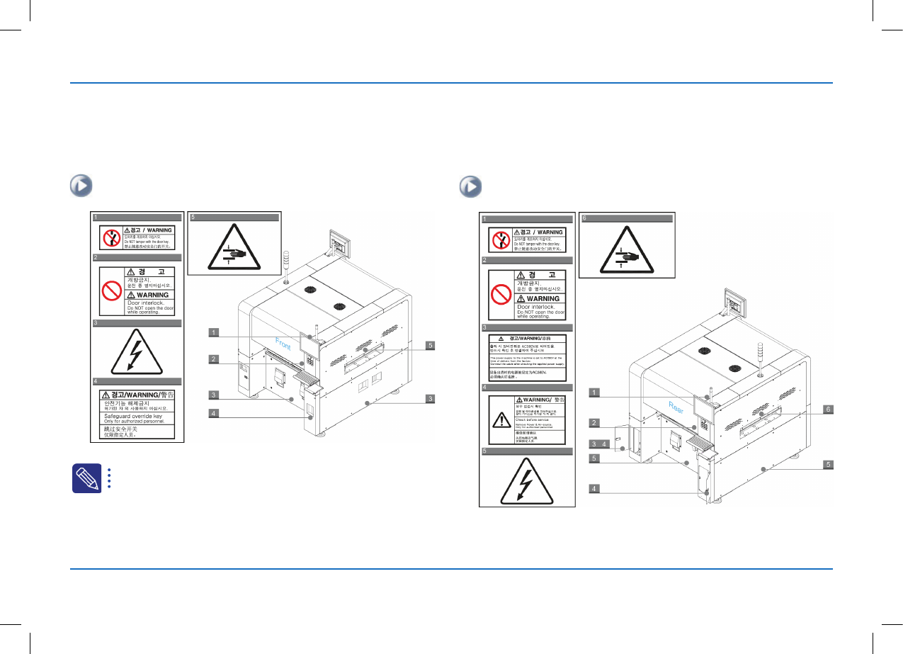※ 安全警告及注意事项 为了安全地使用设备在下列位置粘贴了安全提示标签。 设备内部 安全提示标签的详细内容请参阅 Administrator' s Guide 。 ※ 安全装置( Safety Interlock )的动作 在紧急状况下立刻停止设备运转。 1. EMERGE NC Y 开关 2. Do or Lock 开关
