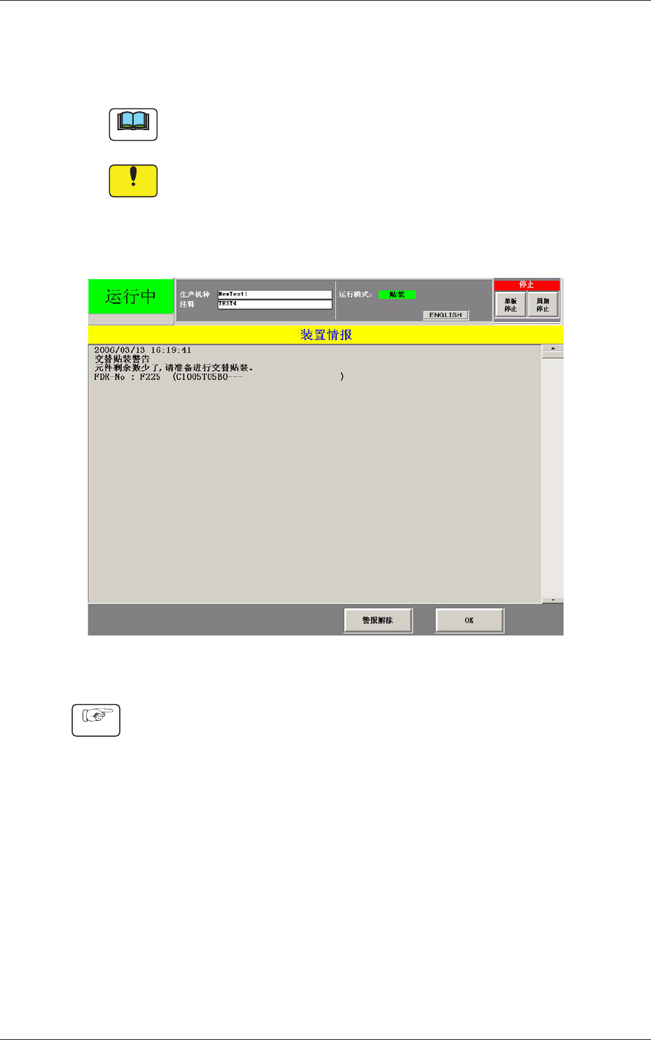 2 - 22 2.2 生产运行中有意识地补给元件时 (7) 设定补给的元件。 • 元件补给了新编带时 按 [ 元件补给 ] 按钮。 确认送料器一览内的余量,确认已进行元件补给。 • 元件补给了使用过的编带时 ( 编带的元件数和元件数据库中设定的数量不同时 ) 按 [ 当前元件余数 ] 按钮,在“当前元件余数”输入界面输 入补给的元件数。 确认送料器一览内的余量,确认已进行元件补给。 (8) 按下进行了元件补给模块的送料器准备完了开关,打…