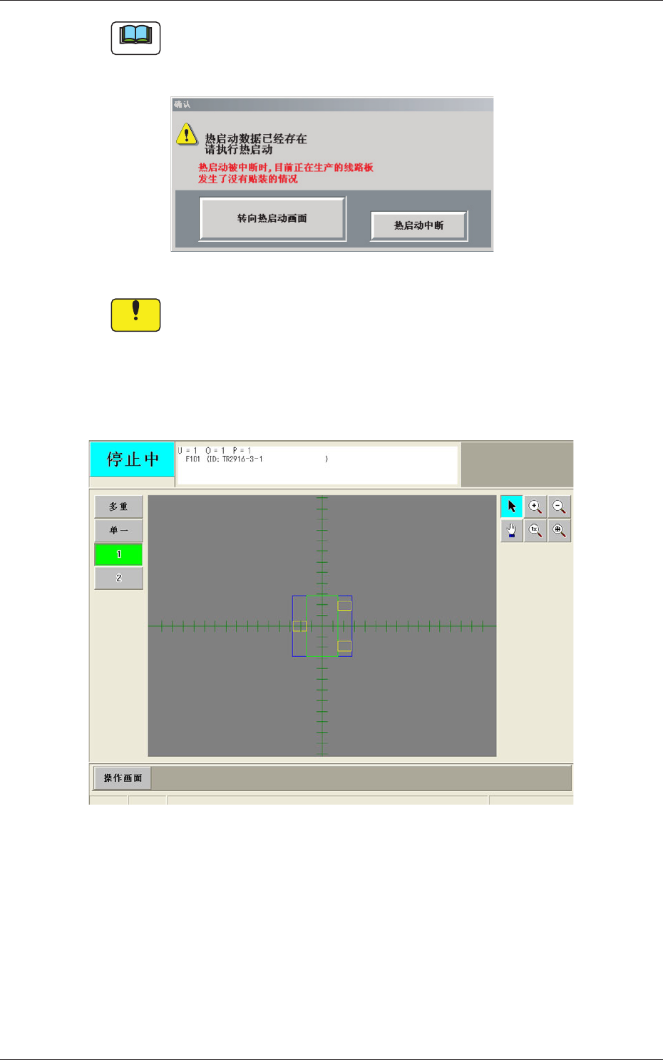 2 - 31 Note 通过以下方法也能显示“热启动开始”界面。 在 (1) 的状态下按操作台的 [START] 按钮,显示确认界面,因此请按 [ 转向热启动画面 ] 按钮。 Fig.1B24-4 Notice 中断热启动时,有可能发生未能在当前生产中线路板上实装的情况。 建议通过热启动重新开始生产。 (4) 确认各安 装头的最 终贴装 元件是否 被贴装。 按 [ 最终贴装位置 移动 / 确认 ] 按钮。 显示确认界面。 Fig.1B2…