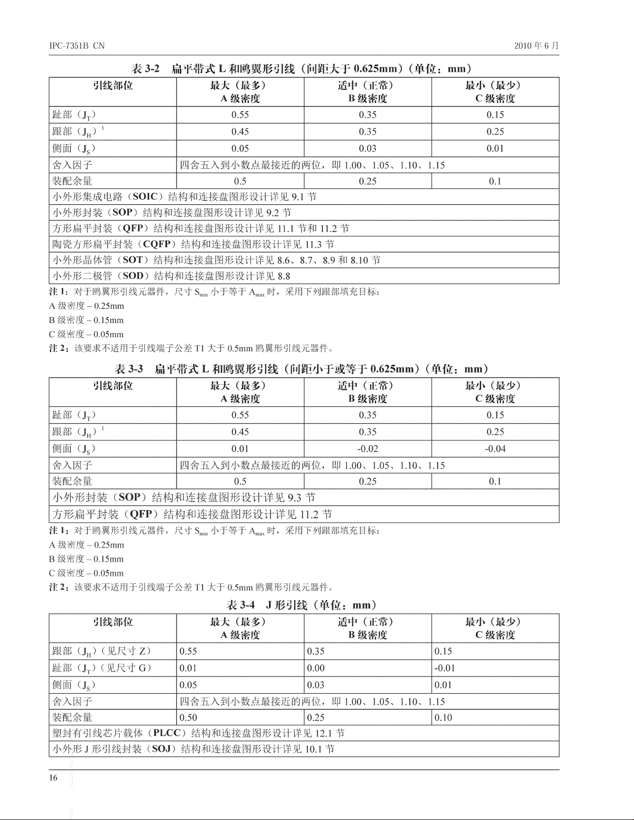 2 0 1 0 年 6 月 I P C - 7 3 5 I B CN 表 3 - 5 大 于 或 等 于 16 08 ( 0 6 0 3 ) 的 矩 形 或 方 形 端 元 器 件 ( 电 容 和 电 阻 ) ( 单 位 : m m ) 引线 部 位 最 大 ( 最 多 ) A 级 密 度 适 中 ( 正 常 ) B 级 密 度 最 小 ( 最 少 ) C 级 密 度 趾 部 ( J T ) 0 .55 0 3 5 0 . 1 5 跟 …