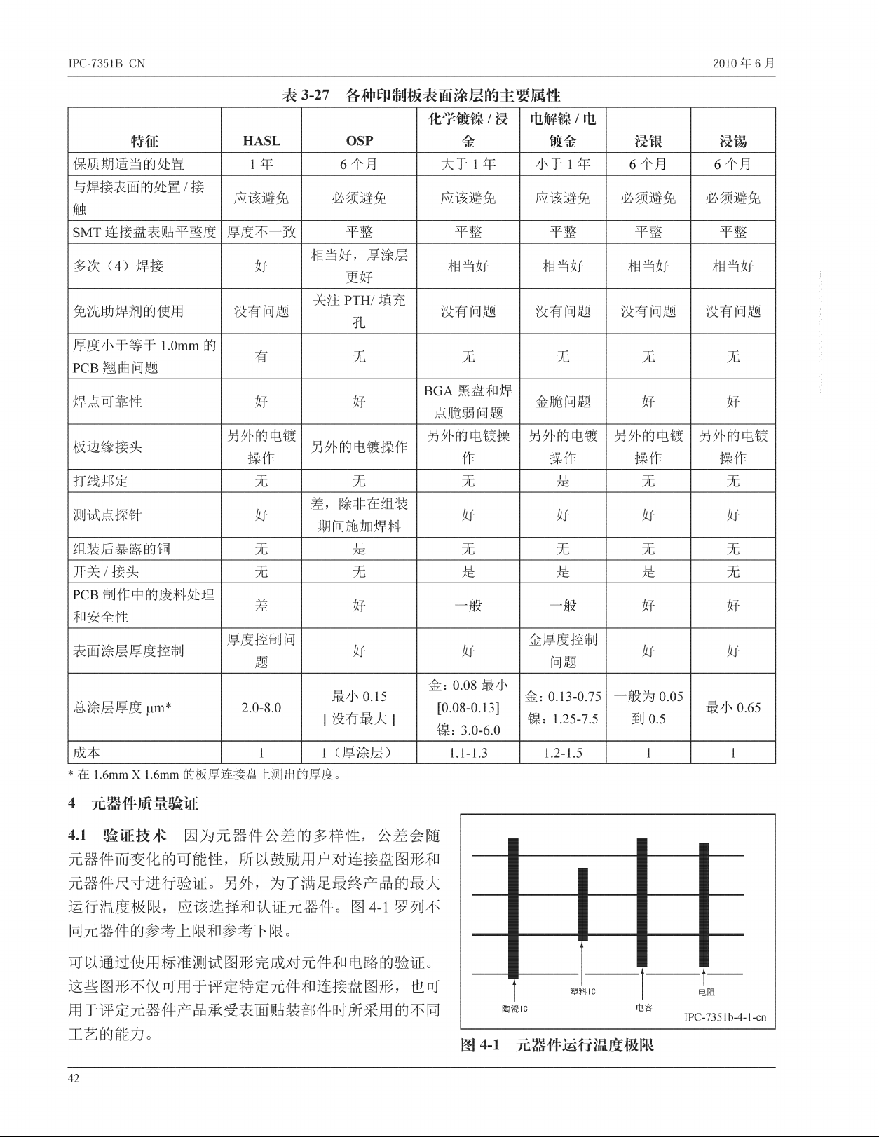 I P C - 7 35 1 B CN 2 0 1 0 年 6 月 表 3 - 2 7 各 种 印 制 板 表 面 涂 层 的 主 要 属 性 特 征 H A S L O S P 化 学 镀 镍 / 浸 金 电 解 镍 / 电 镀 金 浸 银 浸 锡 保 质 期 适 当 的 处 置 1 年 6 个 月 大 于 1 年 小 于 1 年 6 个 月 6 个 月 与 焊 接 表 面 的 处 置 / 接 触 应 该 避 免 必 须 避 免 应 …