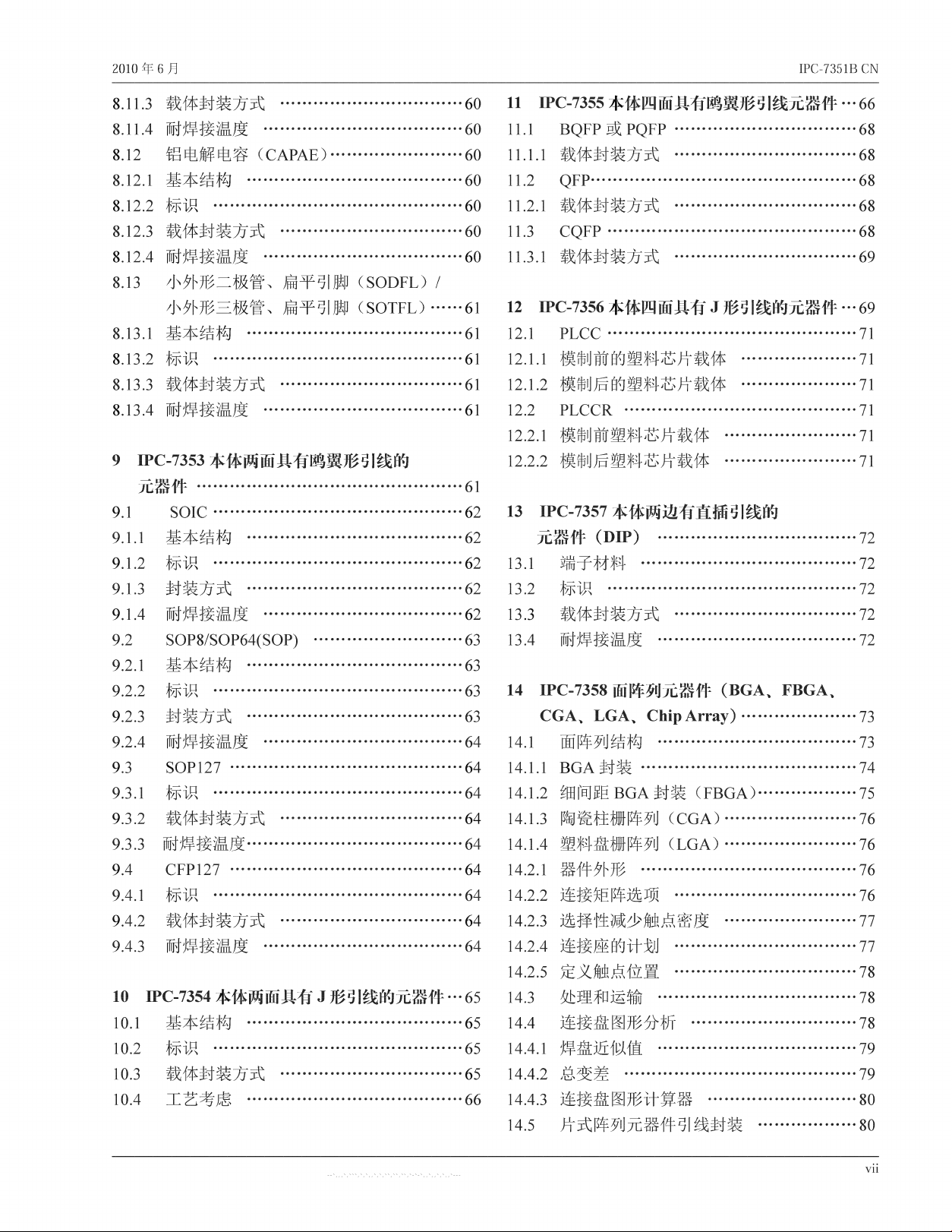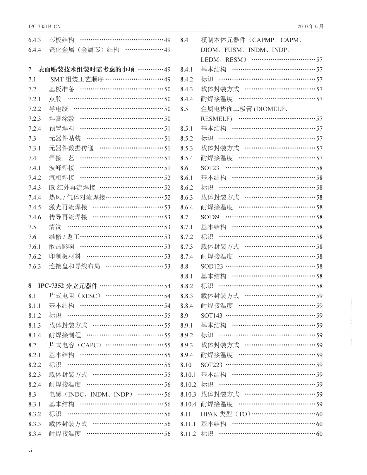 I P C - 7 35 1 B CN 2 0 1 0 年 6 月 6 . 4 3 芯 板 结 构 6 . 4 . 4 瓷 化 金 属 ( 金 属 芯 ) 结 构 … " 1 表 面 贴 装 技 术 组 装 时 需 考 虑 的 事 项 7 . 1 S M T 组 装 工 艺 顺 序 " … … … … 1 2 基 板 准 备 1 2 A 点 胶 1 2 1 导 电 胶 … 1 2 3 焊 膏 涂 敷 7. 2 . 4…