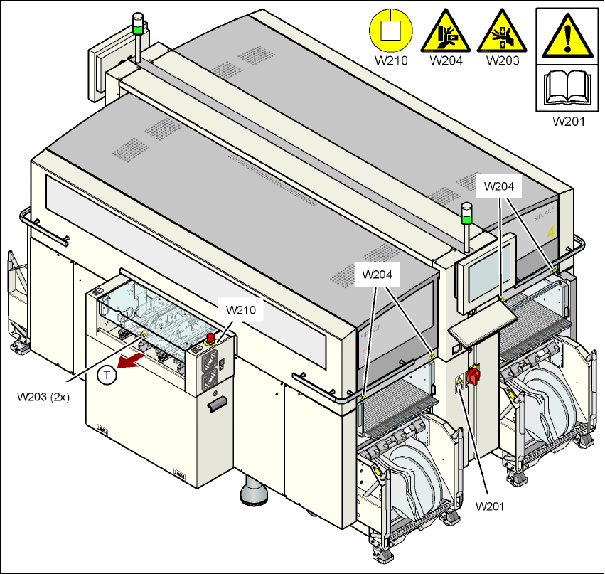 Segurança do funcionamento Manual do usuário SIPLACE Série X Placas de aviso A partir da versão de software SR.70x.xx Edição 01/2011 44 Fig. 2.2 - 2 Placas de aviso W20 3, W204 e W210 na máquina - parte 2 Pos. W203, nº d…