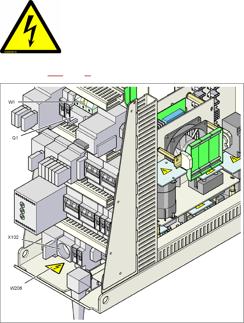 Fig. 2.2 - 6 Placa de aviso W206 na tomada para assistência técnica X102 e W1 no interruptor principal Q1