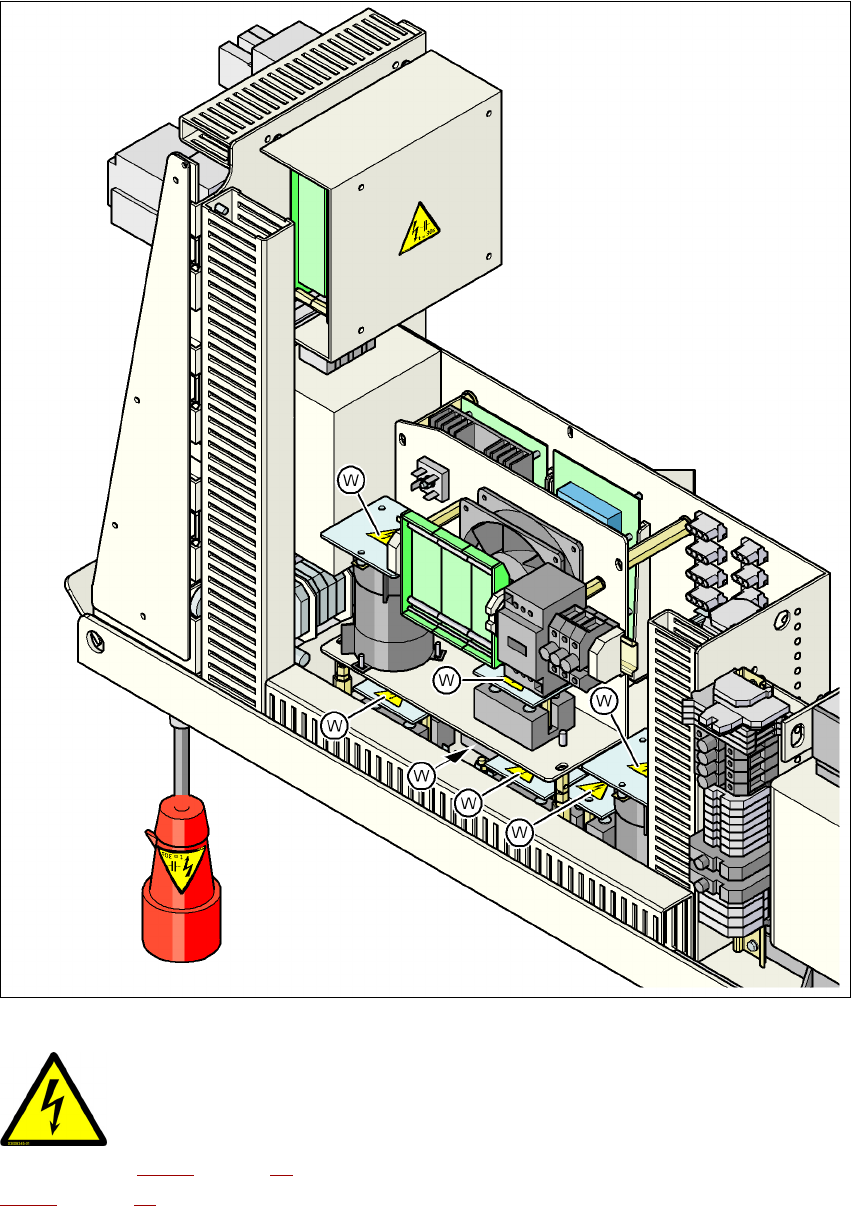 Fig. 2.2 - 8 Placa de aviso W na cobertura sobre a alimentação de corrente para o servoamplificador