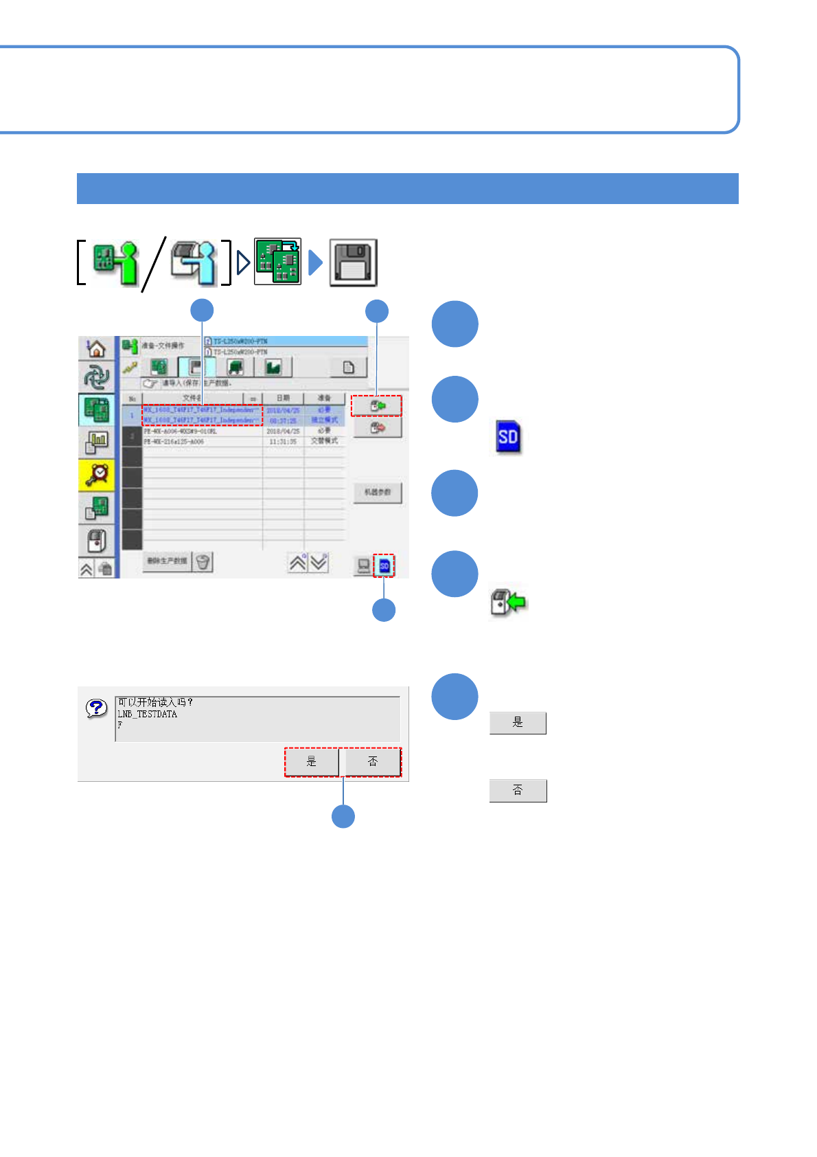 NPM-W X/WXS EJM9DC-MB-03O-0 0 经由 LNB 从 DGS 传输到设备 / 双轨模式 1 2 3 3-1-3 -3 5 6 3 4 2 4 7 7 1 6 5 文件 操作 生产数据的读入 2 操作手册 3-1-3 分别读取轨道 1 、轨道 2 的生产数据。即使在属于相同种类 的情形下,也请分别读取生产数据 。 选择文件读入的来源 : LNB ● 通过按下轨道区域,来选择轨道。 选择轨道 选择读取处 选择文件 注…