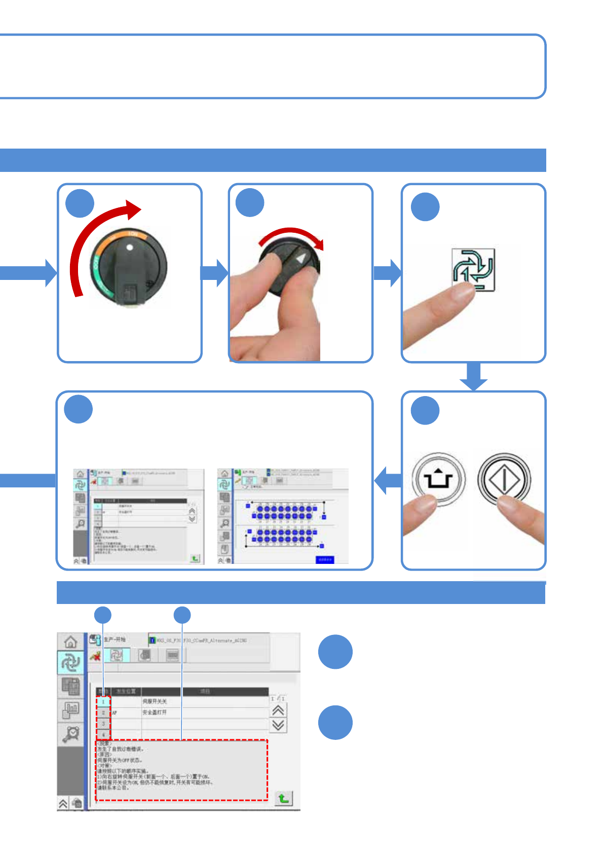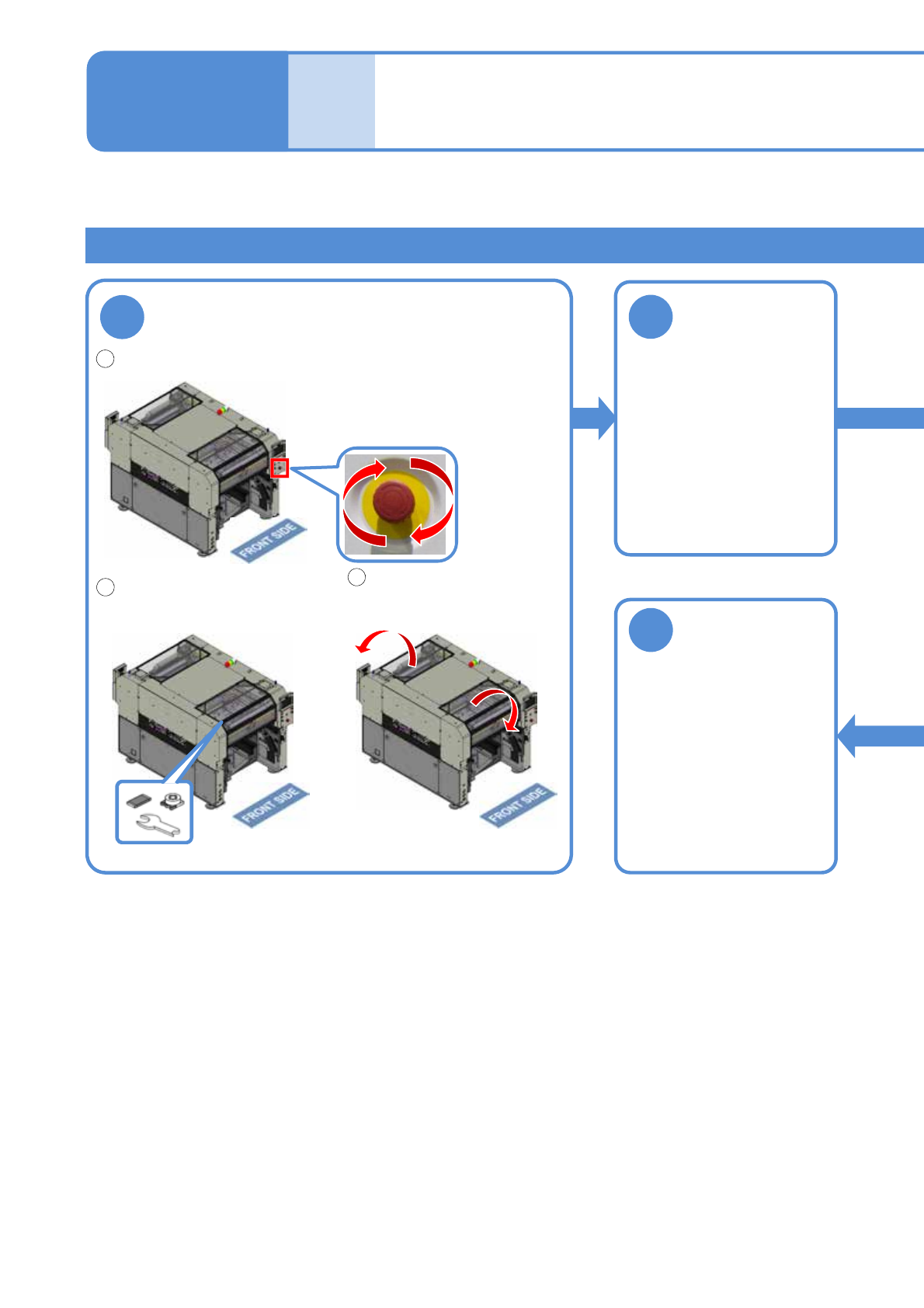 NPM-W X/WXS EJM9DC-MB-04O-0 0 8 开始生产 4-1-1 -1 1 運転前の確認 1 2 3 2 生产 生产的开始 1 操作手册 4-1-1 对生产的开始方法进行说明。是操作 员的日常操作。 紧急停止开关是否已解除。 ●解除时,确认没有危险或者异常状 况, 把紧急停止开关往右转。 传送带或者供料器工作台上必 须没有异物。 前侧、后侧的安全盖必须是 关闭状态。 如果设置了以下的 单元时,请将以下 单元的主电源开…