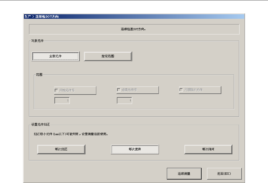操作手册Ⅱ 3-78 3-5-4-4 连续检查 图 3-5-4-4-1 选择 SOT 方向连续检查画面 (1)对象元件 仅检查元件数据中某一条件与之一致的元件时,进行此项设定。 1) 全部元件 检查所有的元件数据。