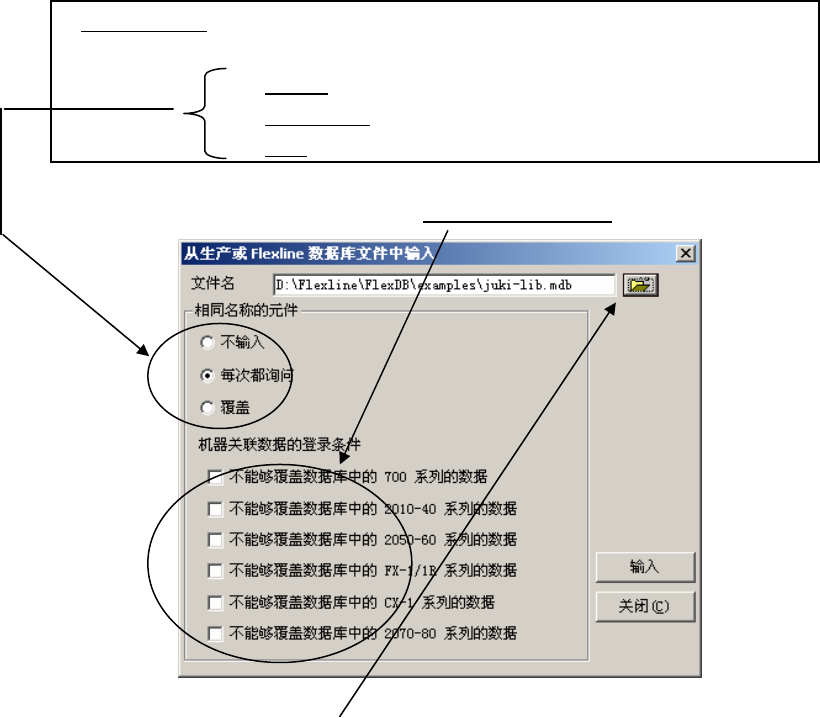 操作手册Ⅱ 4-12 4-1-1-3-3 注册(在数据库中注册) 对生产程序或其它数据库已注册的所有元件数据,进行统一注册。 <步骤> ①在菜单栏中,单击“数据”-“注册” 。 ②显示如下画面。请设定选择文件和注册时的条件。 ⅰ) 指定注册条件。 ※“ 注册条件 ” ∶ 设置当执行统一注册时, 如果数据库中已有同名元件注册时, 是 要进行覆盖注册、还是不注册。 ●不输入 ∶有同名的元件时不进行覆盖。 ●每次都询问 ∶显示信息…