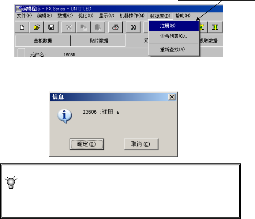 ②选择要注册的元件(若是清单画面,请先单击元件所在行),再单击“数据库”-“注册”。
