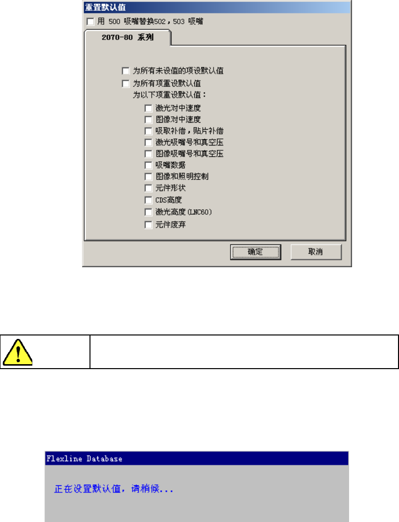 操作手册Ⅱ 4-16 4-1-1-3-7 替换 (1)重置默认值 在显示元件清单或元件表格时,从菜单栏中选 择“数据”-“替换”-“重置默认值”后,显 示如下画面。 ● 将 502 、503 号吸嘴替换为 500 号吸嘴 已设定为激光定心和图像定心的502号吸嘴和503号吸嘴全部被换为500号吸嘴。 注意 一旦替换为 500 号吸嘴, 即无法恢复原 502 号吸嘴和 503 号数据。 ● 标签内的选项 将选择的项目重新设定为默认值。 重…