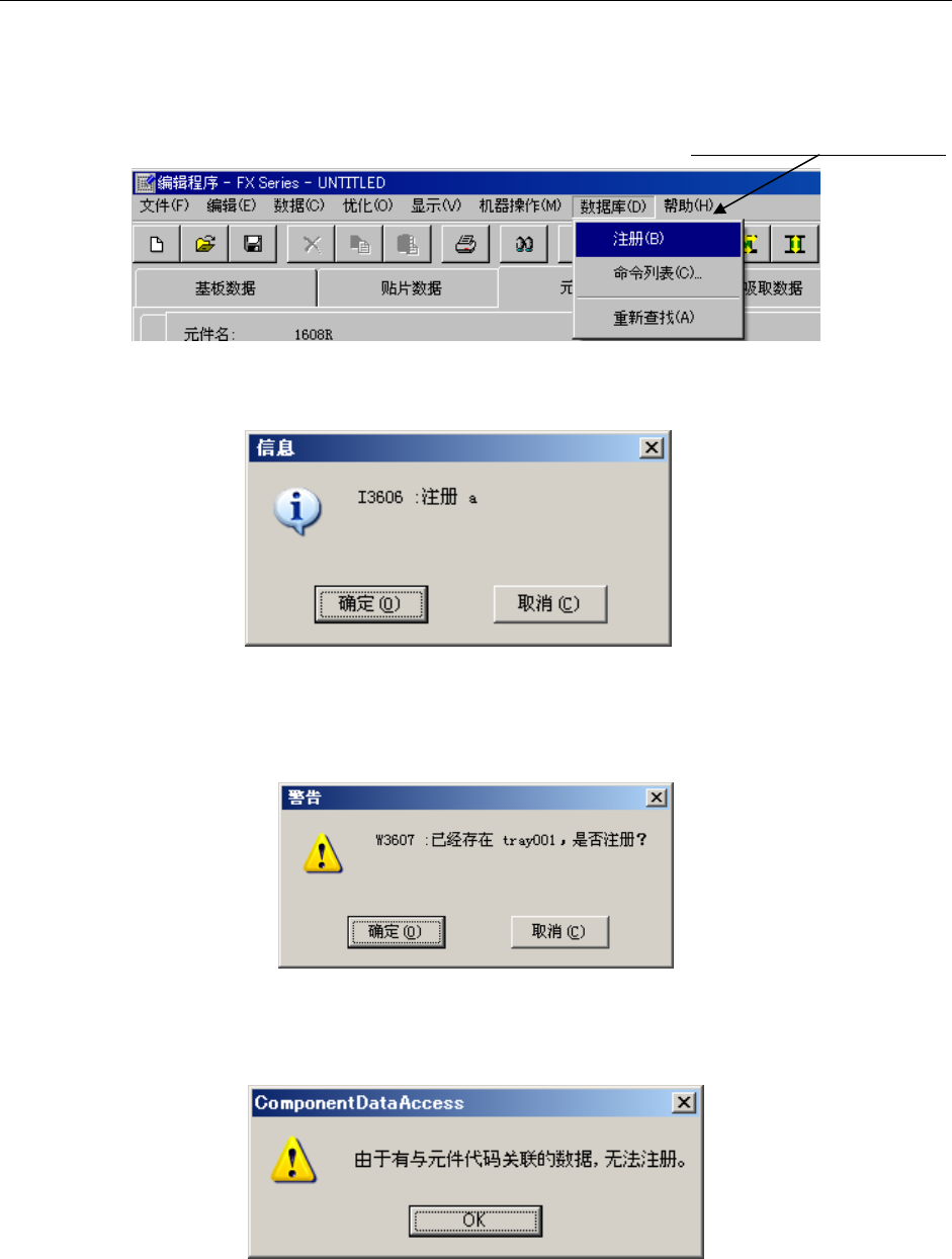 操作手册Ⅱ 4-31 4-1-2-2 元件数据的注册(IS元件数据库) 在“编辑程序”里对生产程序文件的元件数据逐一进行注册。 <步骤> ① 打开“编辑程序”的“元件数据” 。 ② 选择要注册的元件(若是清单画面,请先单击元件所在行),再单击“数据库”/“注 册” 。 图 4-1-2-2-1 菜单栏 ③ 显示如下画面,单击“确定”,即可完成注册。 图 4-1-2-2-2 注册询问提示 已有同名元件注册时,会显示下列对话框。要…