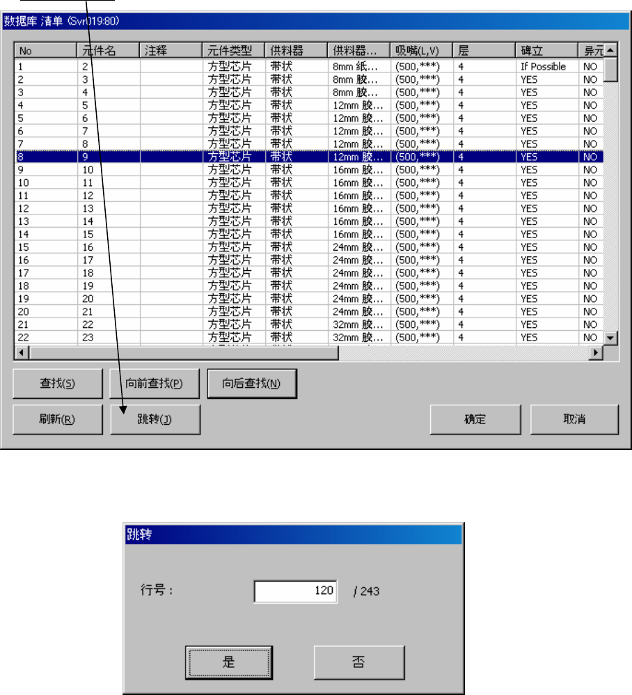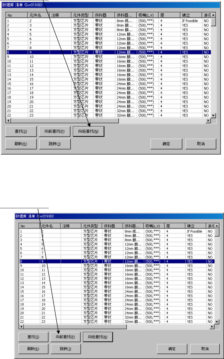 操作手册Ⅱ 4-33 4-1-2-3-2 向后查找符合的元件数据 单击“向后查找”。 图 4-1-2-3-2-1 向后查找 显示下一个与查找条件一致的元件数据。 4-1-2-3-3 向前查找符合的元件数据 单击“向前查找”。 图 4-1-2-3-3-1 向前查找 显示当前显示的元件数据以前的、符合查找条件的元件数据。