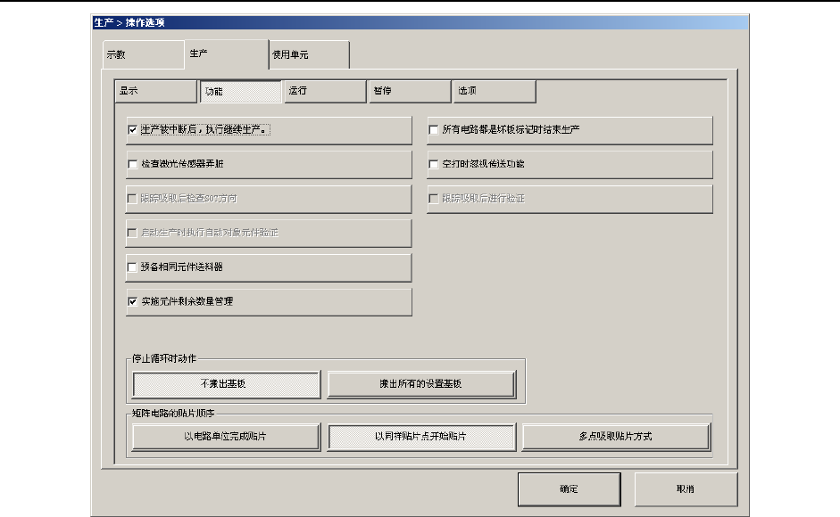 操作手册Ⅱ 4-40 内容 序号 项目 状态 动作及详细内容 设置生产开始时有吸取率不良的送料器显示确认对话框。 吸 取错误条件,在机器设置中进行设置。 生产开始时,有吸取率低于设置值的送料器时 显示 确认对话框。 12 生产开始时,显示吸取错误 生产开始时,有吸取率低于设置值的送料器时 不显 示确认对话框。 无元件暂停对话框中显示的发生错误的贴片头 的判定是激 光、还是真空。 无元件暂停对话框显示“判定”项目,显示无 元件 的判定。 …