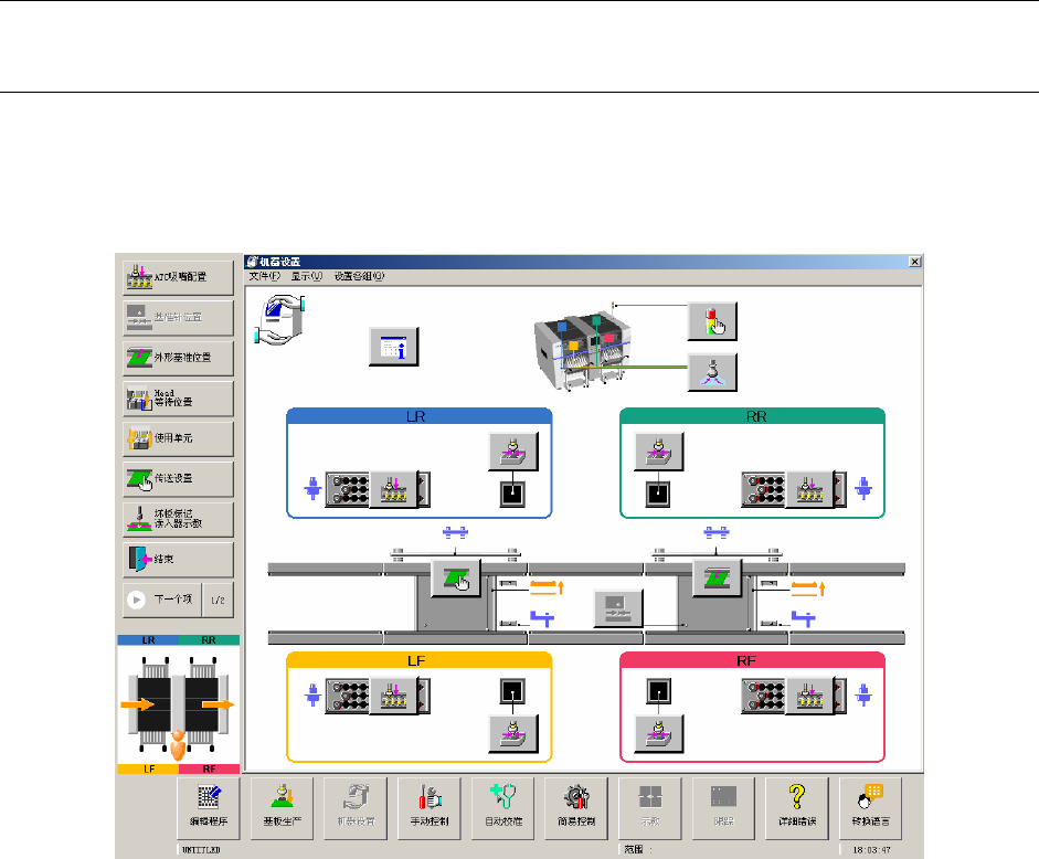 操作手册Ⅱ 4-57 4-4-2 机器设置的启动与退出 4-4-2-1 启动机器设置 从菜单栏中选择 “设置” - “机器设置” , 或直接从画面下侧的功能栏中选择 “机器设置” 后, 可显 示下图所示的机器设置初始画面。 构成图画面的中部设有启动各单元设置画面的按键。 画面左侧的工具栏中设有常用功能的按键。 图 4-4-2-1-1 机器设置初始画面(构成图) 按下构成图中的各按键后,可显示相应的各单元设置画面。 同时画面还可显示 AT…
