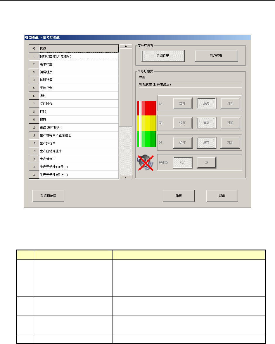 操作手册Ⅱ 4-90 (3) 初始值 表 4-4-4-11-2 初始值 信号灯模式 No. 状 态 点亮状况 赤 黄 绿 警报器 备注 1 初始状态(打开电源后) 全部点亮 OFF 2 菜单状态 黄灯点亮 ― ― OFF 3 编辑程序 黄灯点亮 ― ― OFF 4 机器设置 黄灯点亮 ― ― OFF 5 手动控制 黄灯点亮 ― ― OFF 6 通过 黄灯点亮 ― ― OFF 7 文件操作 黄灯点亮 ― ― OFF 8 打印 黄灯点亮 ―…