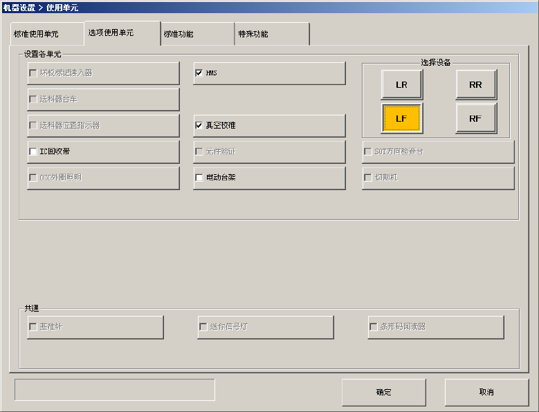 可以选择各标签,设置“标准使用单元”、“选项使用单元”、“标准功能”、“特殊功能”。