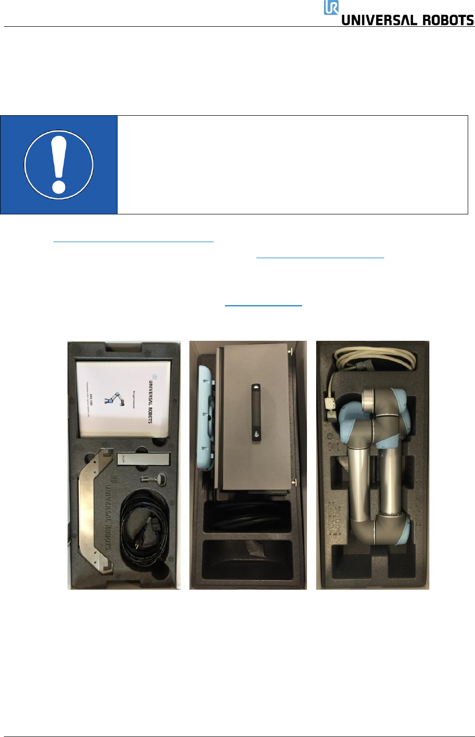 • 在 www.universal-robots.com/support/下载有关机器人类型和包装材料的正确装箱程序。