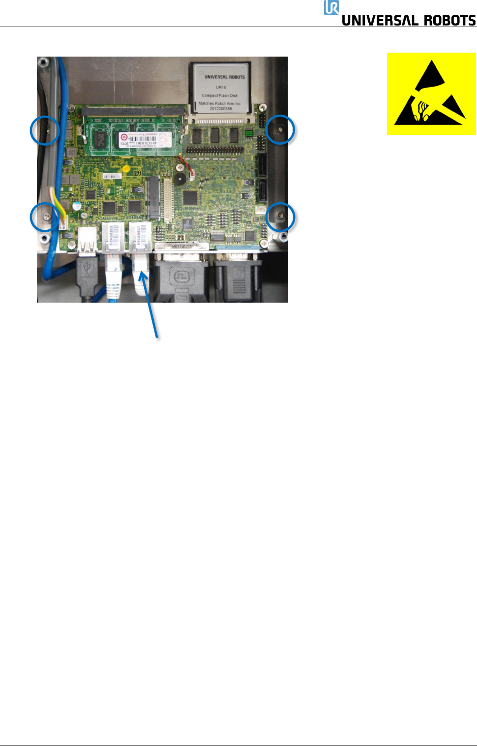 保留所有权利 65 Servicemanual_UR5 _en_3.2.6 3.2.2 更换主机板 3.1 警告: 在更换控制箱内部的任 何组件之前,必须完全关 闭控制箱,这至关 重 要。 遵循 5.3.7 完成重启顺序 一节中的前 3 个步骤。 完成以下更换时 ,请遵循 3.0 处理易受静 电损坏零件 中列出的指 引 注意: • 主机板 3.0 使用小型闪存 卡。 • 主机板 3.1 使用 USB 存储盘。 主机板 3.1 来自序列号…