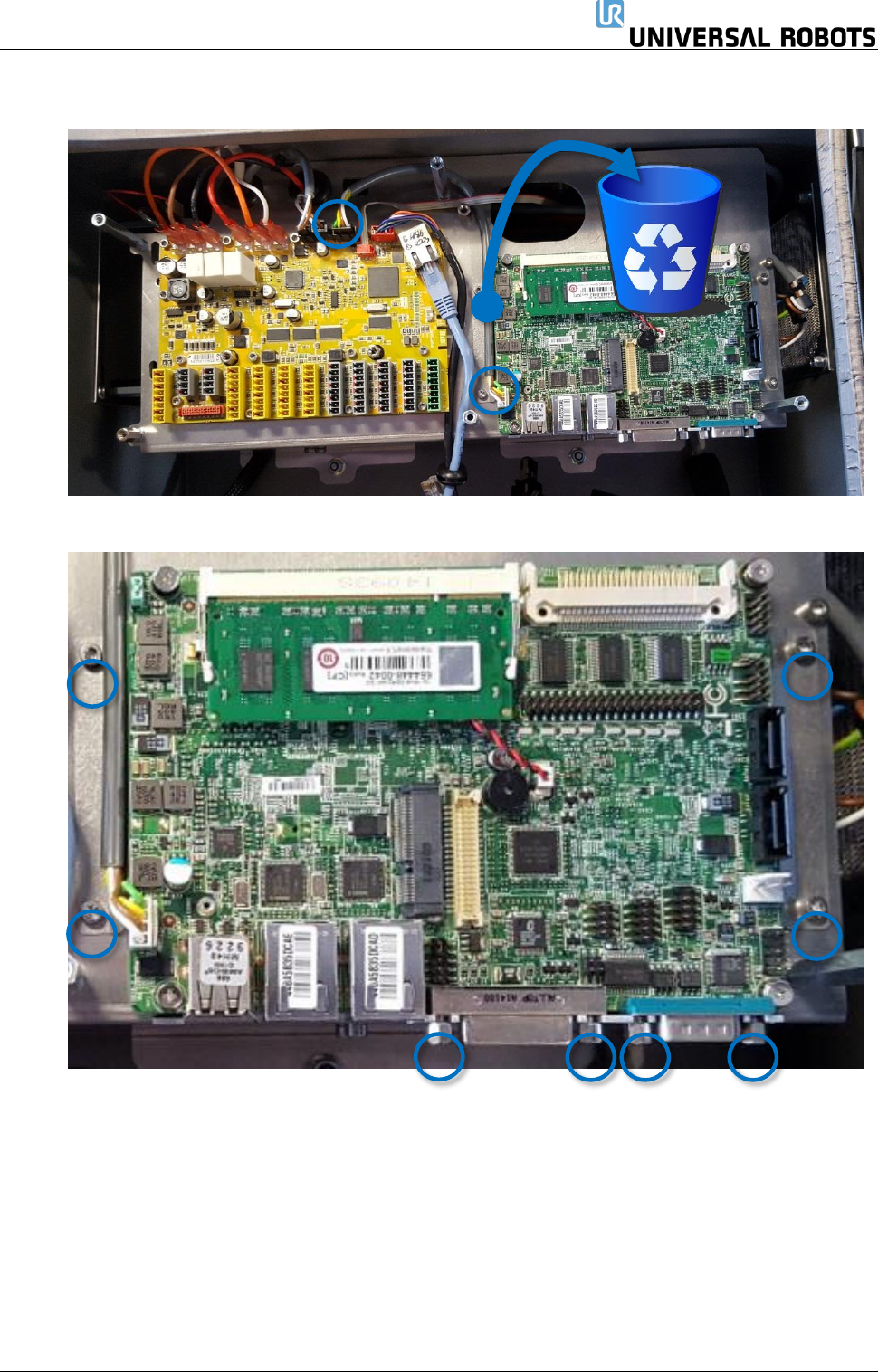 保留所有权利 69 Servicemanual_UR5 _en_3.2.6 3.2.3.1 硬件 • 操作控制器时,请务必 使用防静电腕带。 • 拆下 7 x T20 梅花头螺 钉,将护板拆卸下来。 • 拆下连接到主机板和小 型闪存卡的所有电缆 将防静电腕带 戴在手腕上。将 腕带 与系统接地点 连接 。 其可将身体内的所有静 电释放到地面。