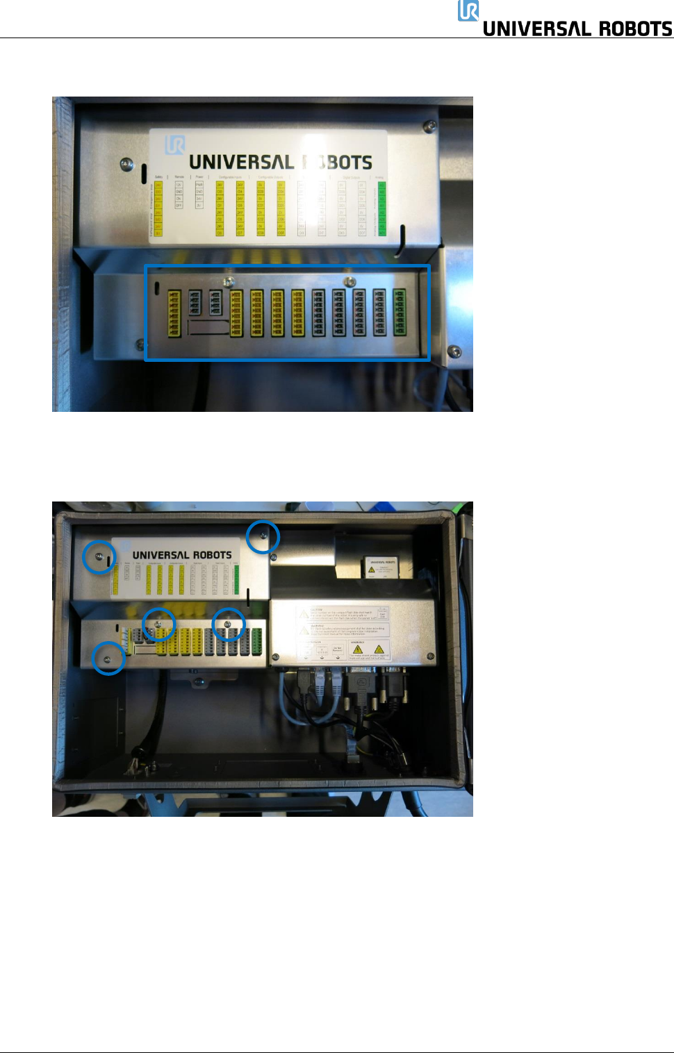 保留所有权利 76 Servicemanual_UR5 _en_3.2.6 2. 关闭控制器并断开电源 线,然后打开控制器机柜 ,并 小心地拆下所有插头和 连接器 3. 拆下 5 个梅花头螺钉,然后拆下铝 盖。