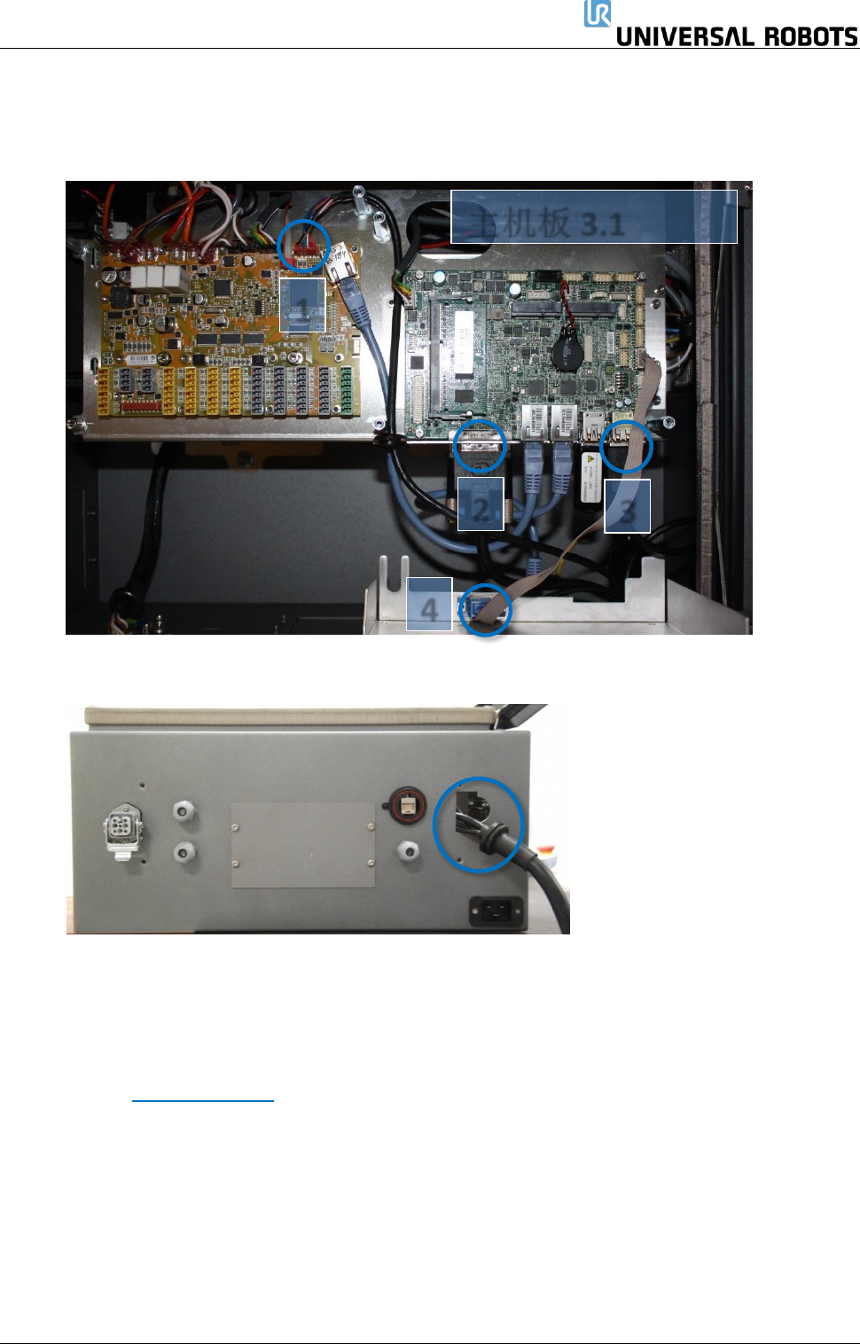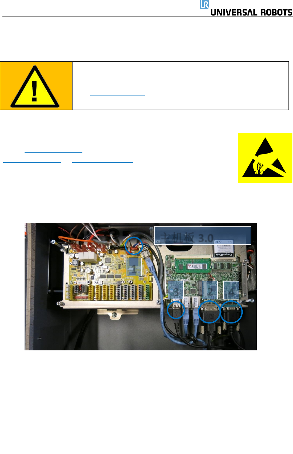 保留所有权利 78 Servicemanual_UR5 _en_3.2.6 3.2.5 更换示教器 3.2.5.1 原装控制箱 警告: 在更换控制箱内部的任 何组件之前,必须完全关 闭控制箱,这至关 重 要。 遵循 5.3.7 完成重启顺序 一节中的前 3 个步骤。 完成以下更换时 ,请遵循 3.0 处理易受静 电损坏零件 中列出的指 引 注意:使用相同 的程序,关闭电源 并拆除铝盖 板,如 3.2.1 更换主机板 3.0 、 3.2.…