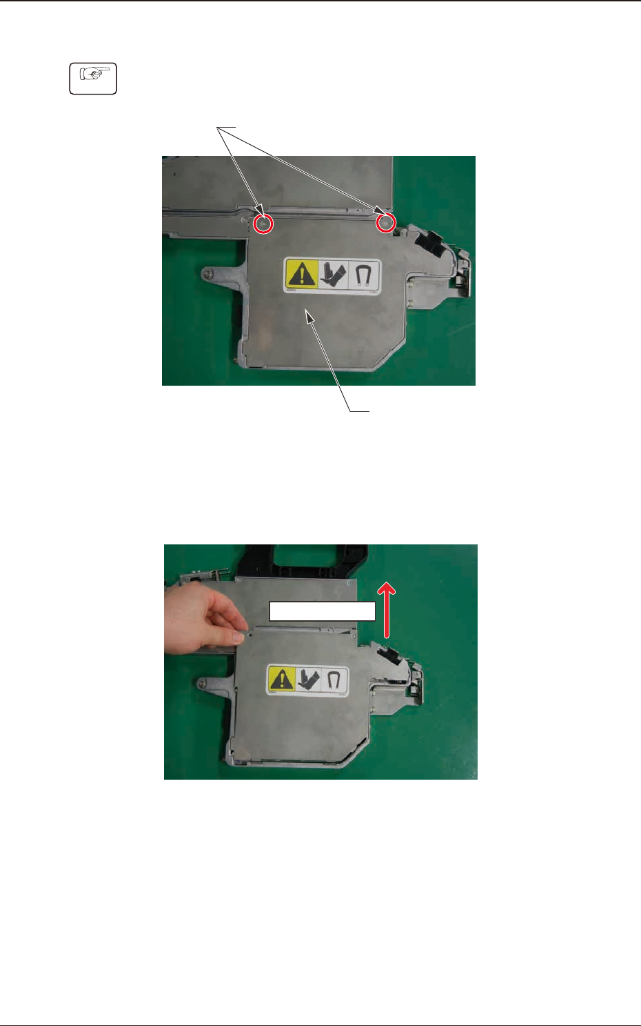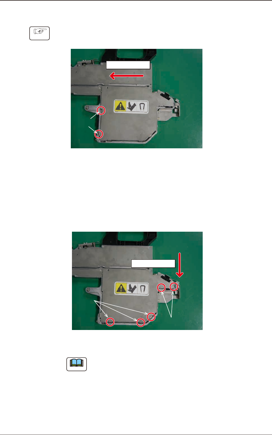 1209-001 7.5.1.6 PCB BOX Cover Attachment Procedure Procedure (1) Hold the right side of the PCB BOX Cover and slide it in the arrow direction to insert two claws. (Step 1) Sliding Direction Step 1 Fig. G22 (2) Hold the …