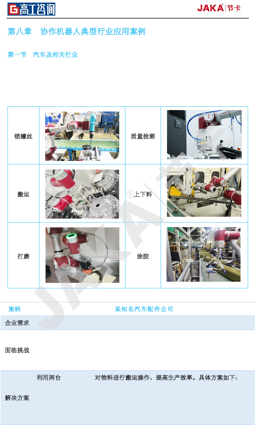 2020 年协作机器人产业发 展蓝皮书 62 第八章 协作机器人典型行业应用案例 第一节 汽车及相关行业 协作机器人因具 有体积小 巧、安全性高、 柔性灵活等特性 ,所以得到汽 车 相关企 业的 广泛关注。在汽 车生产线 中引入协作机器 人,可实现更智 能的生产方式 。协作机器人主 要 应用在汽车锁螺 丝、检测 、上下料、打磨 、装配等工艺 环节 。 锁 螺丝 质 量检测 搬运 上下料 打磨 涂胶 案例 1 某 知 名 汽 车 配 件 …