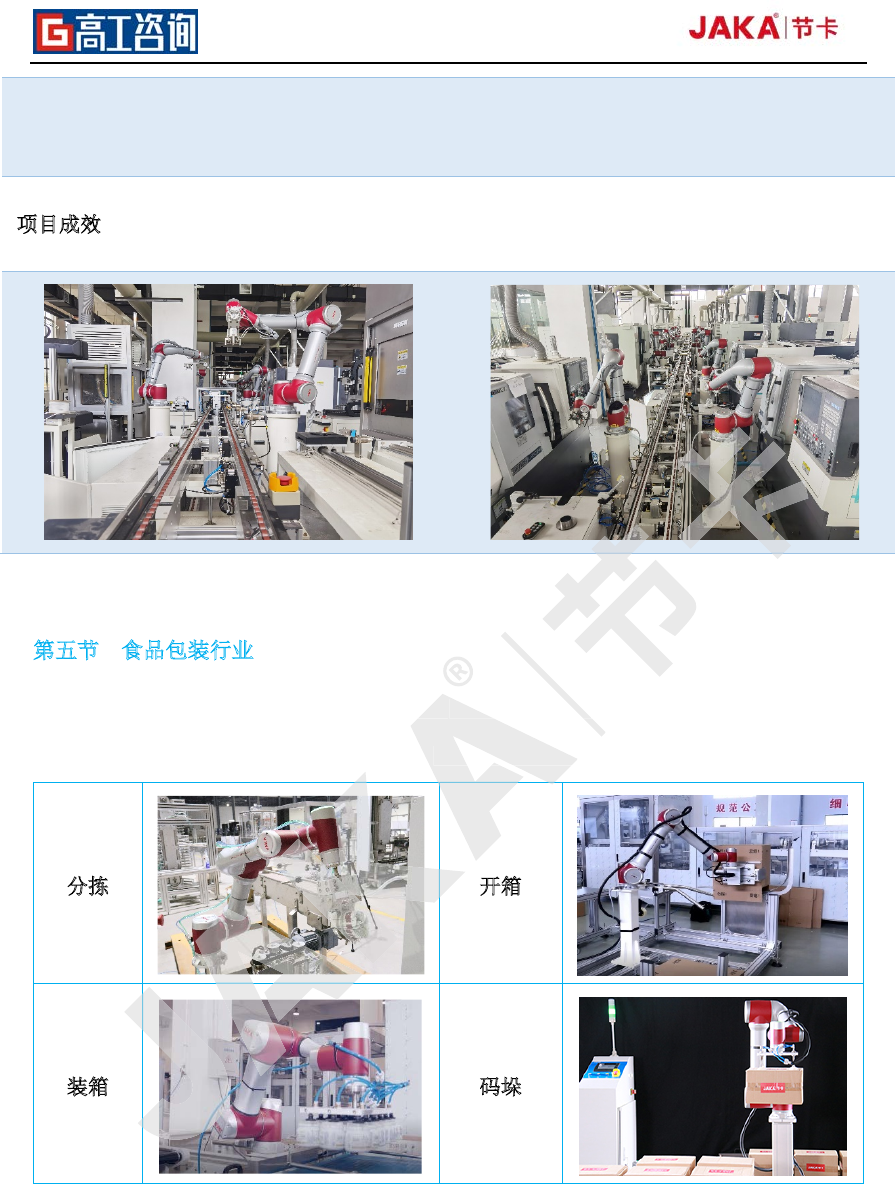 2020 年协作机器人产业发 展蓝皮书 72 案例 1 某零部件厂商 企业需求 希望机器人和人 共同协作 面临挑战 1 、受限于原有 产线布局 、机器人部署空间有 限; 2 、精准完成 上料、转 运、检测、下 料四道工 序。 解决方案 通过 J AK A Z u 3 实现机机 协同、人机协作: 1 、 根 据现场工艺 要求,部署 JAKA Zu 3 压合工作站; 2 、 在 JAKA Zu 3 工作站中,通 过 JAKA Zu 3 取放…