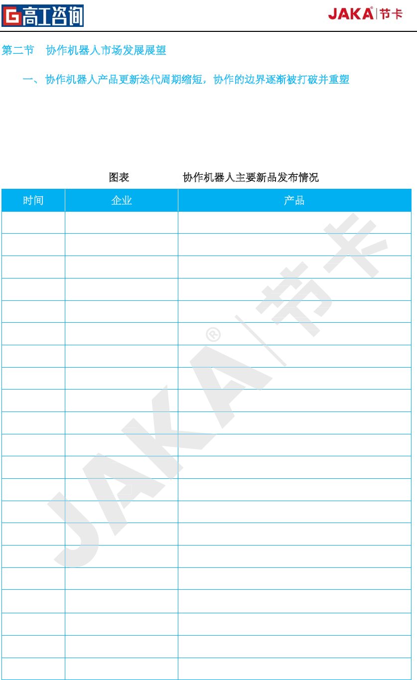 2020 年协作机器人产业发 展蓝皮书 84 第二节 协作机器人市场发展展望 一、 协作机器人产品更新迭代 周期缩短,协作的边界逐渐被打破并重塑 根据 GGII 的 统计, 2019 年共有 21 个 新品 发布,其中 不乏 部分厂商的升 级版产品, 此外 还可以看到不 少厂商均 推出了更大 负载的协作机 器人产 品,如 JAKA 节卡机器人 的 Zu 18 、 优傲的 U R16e ,产品 形态日趋丰 富,协作 的边界逐渐被打 破并重…