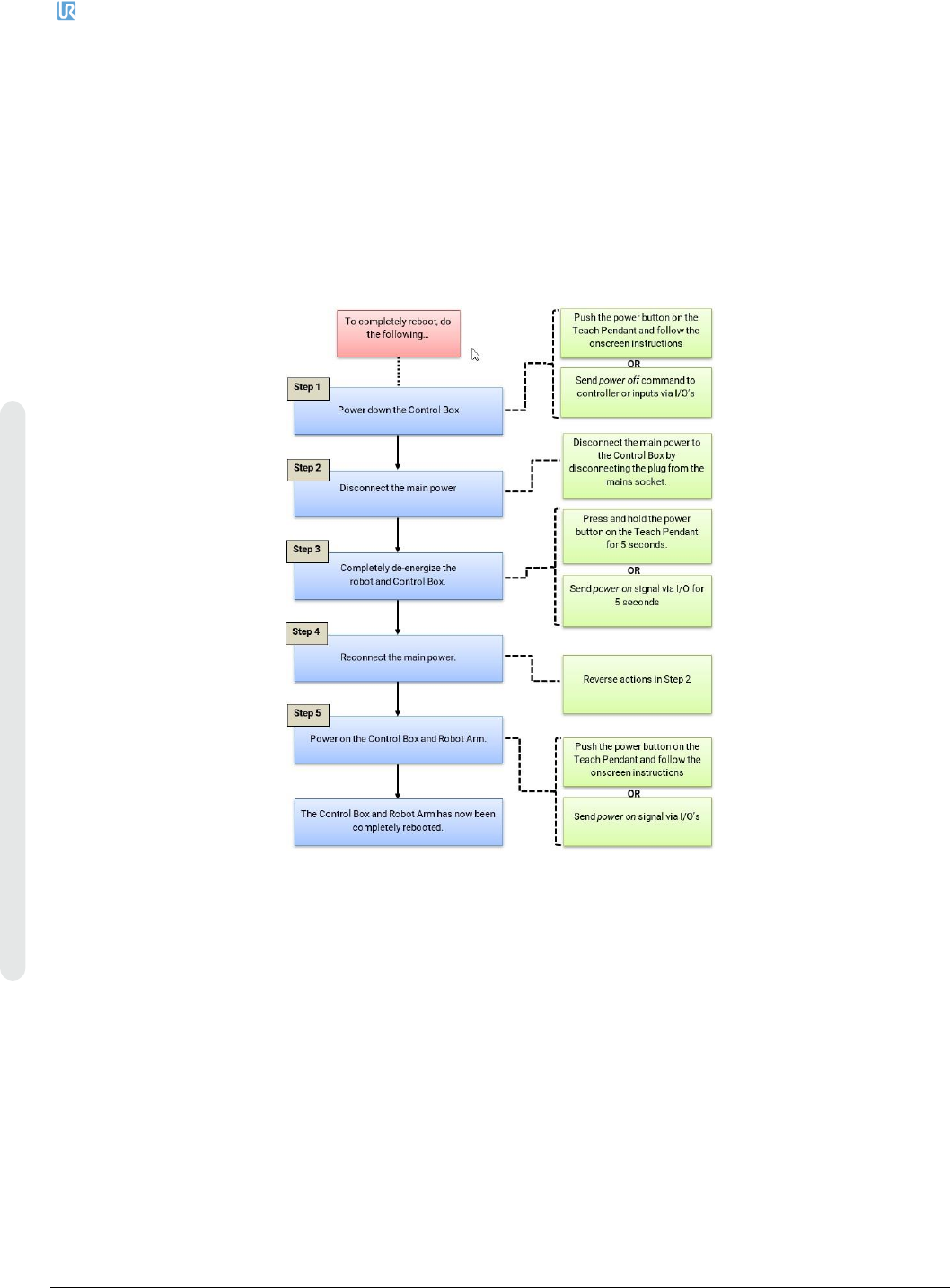 优傲机器人 6. 故障排除 维修手册 162 维修手册 版权 © 2009 – 2020 优傲机器人公 司版权所有。保留所有权利。 ⚫ 外壳材料: P A66 ⚫ 符合: SAE J2 077 、 IS O 8820-3 ⚫ UL 248 专用保险丝 6.5. 完整的重启序列 若要完全重启机器人系 统,请执行以下步骤: 6.6. 保护性停止 另请阅读支持网站 www .universal-robots.com /support 上的第 …
