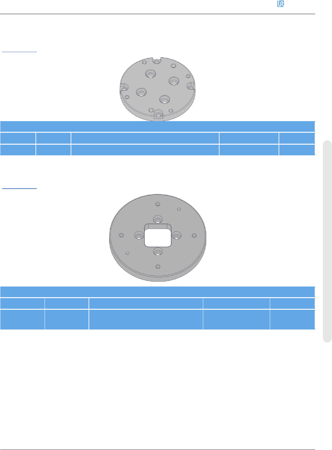 优傲机器人 8. 备件 维修手册 214 维修手册 版权 © 2009 – 2020 优傲机器人公 司版权所有。保留所有权利。 双机械臂校准工具 - 185 500 编号 数量 描述 零件号 页码 1 1 双机械臂校准工具外壳 185500 1 2 1 双机械臂校准工具工具 连接器 185500 3 1 校准工具 GO 工具 185500 4 1 校准工具 NOGO 工具 185500 8.4.3. UR5e 机械臂安 装板( Item…