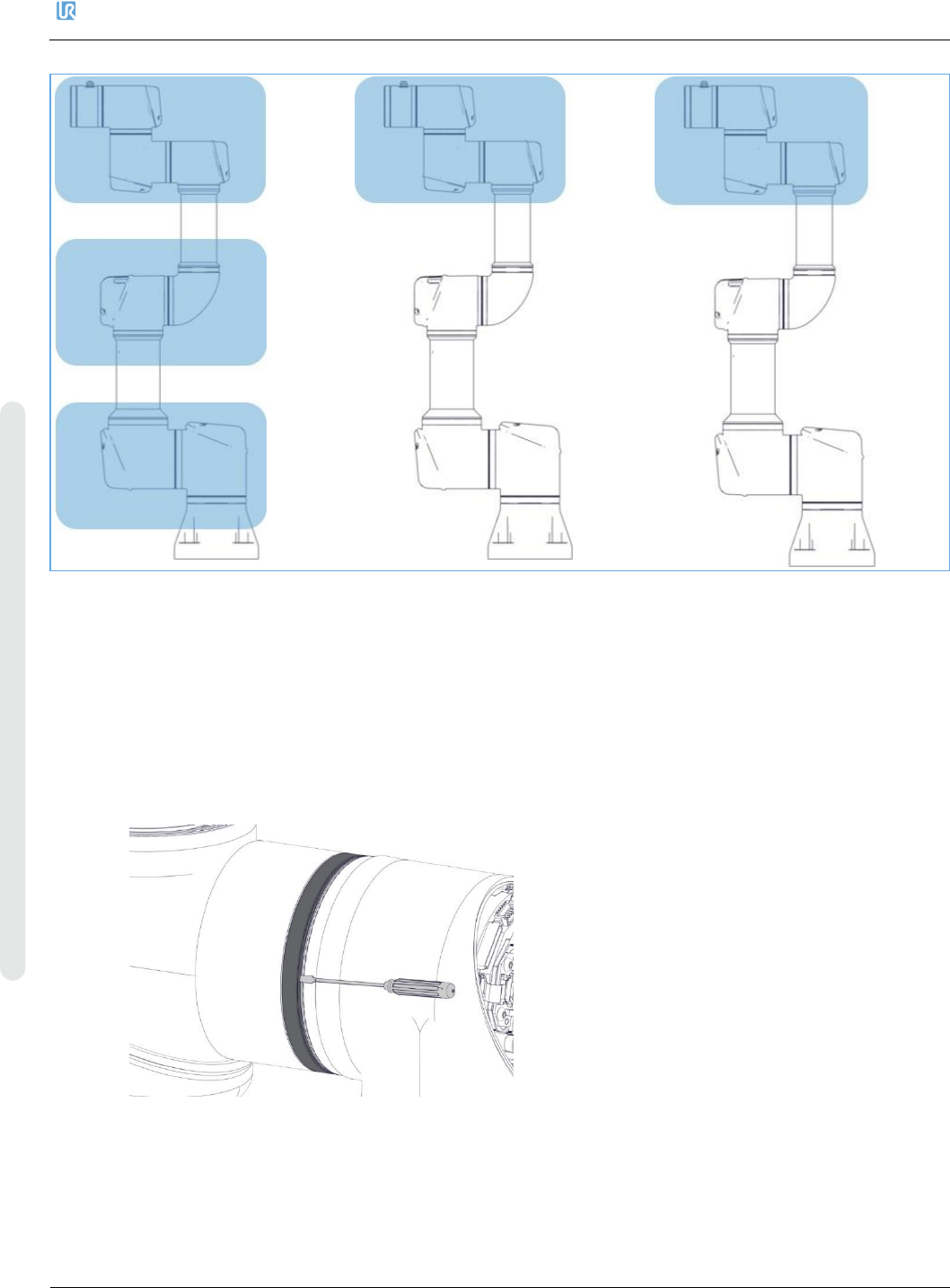 4. 维修和更换零件 优傲 机器人 维修手册 25 维修手册 版权 © 2009 – 2020 优傲机器人公 司版权所有。保留所有权利。 4.2.7. 螺纹连接 以下两节描述拆卸和组 装螺纹连接关节的方式。 螺纹连接位置 UR3e UR5e Ur10e 和 UR16e