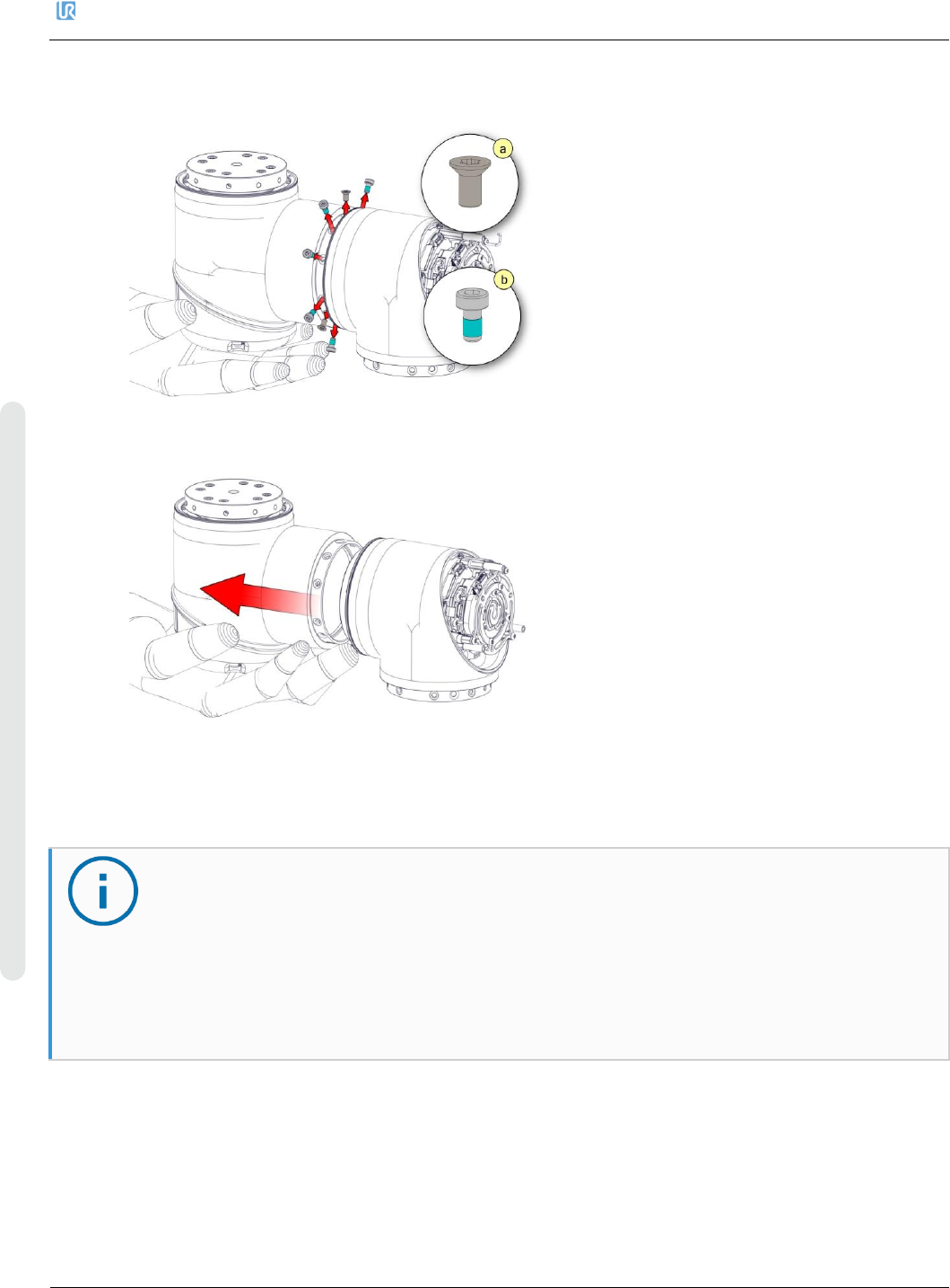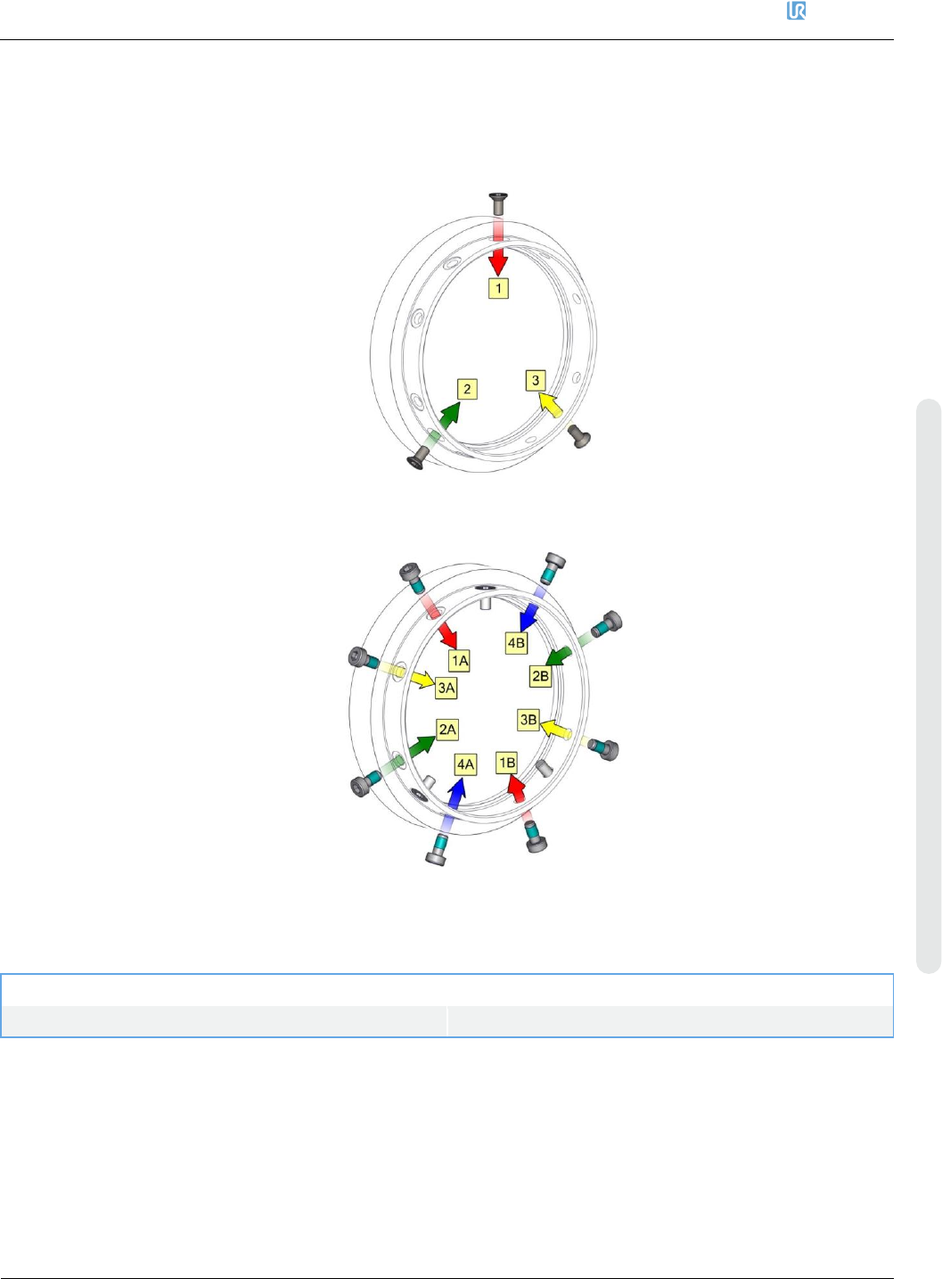 4. 维修和更换零件 优傲 机器人 维修手册 29 维修手册 版权 © 2009 – 2020 优傲机器人公 司版权所有。保留所有权利。 1. 根据标记(在下图中, 用红色箭头表示)确定关 节的方向,并将两个关节 轻轻地推到一起。 2. 根据下图示例,插入六 角沉头螺钉,并拧紧。不 要超过建议的扭矩 。 示例: 1 、 2 、 3 3. 根据下图示例,插入六 角螺钉,并拧紧。不要超 过建议的扭矩。 示例: 1A 、 1B 、 2A 、 …