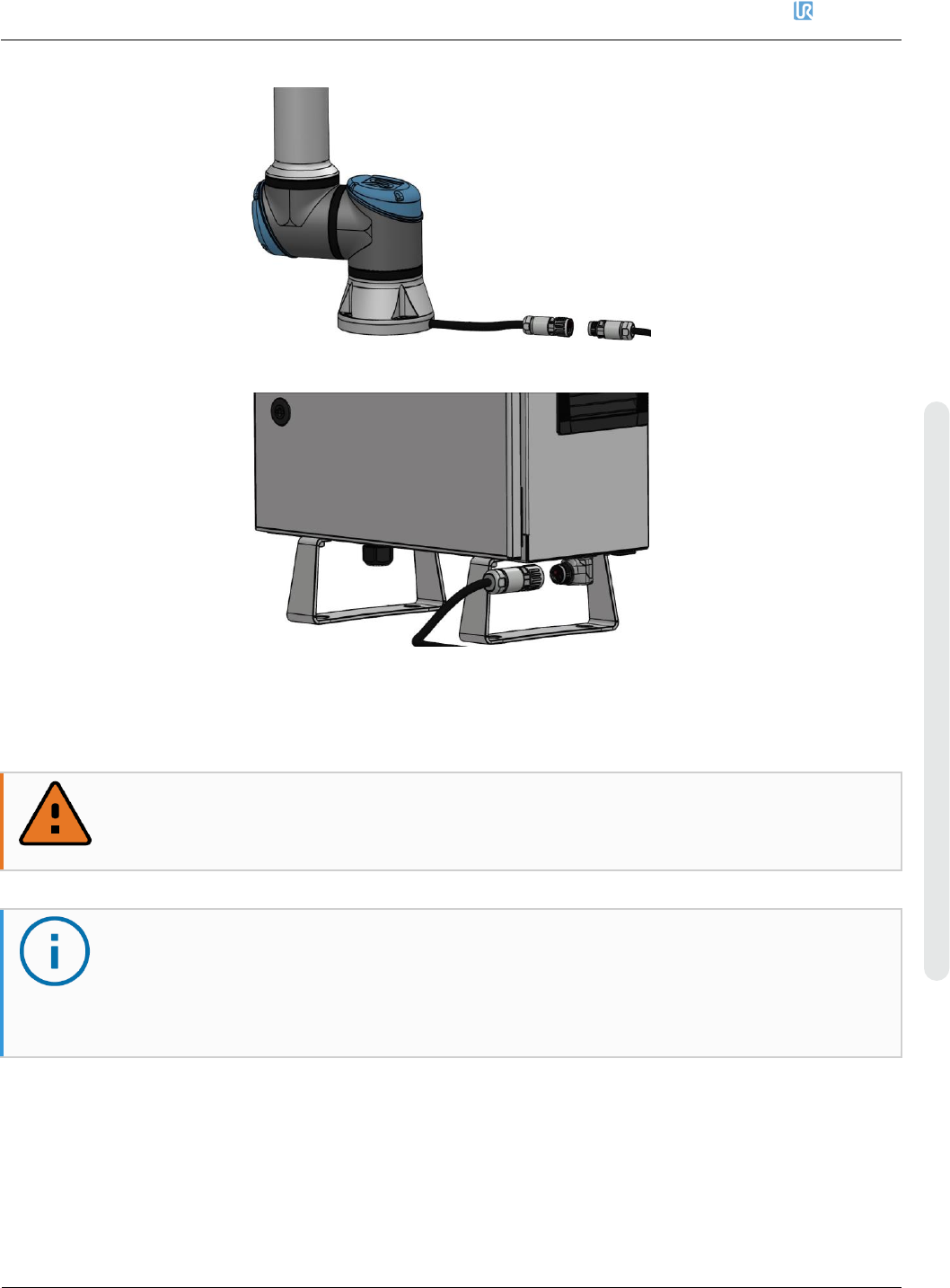 从机械臂到控制箱的最大机器人连接长度为12m。不正确的机器人连接会导致机械臂断电。