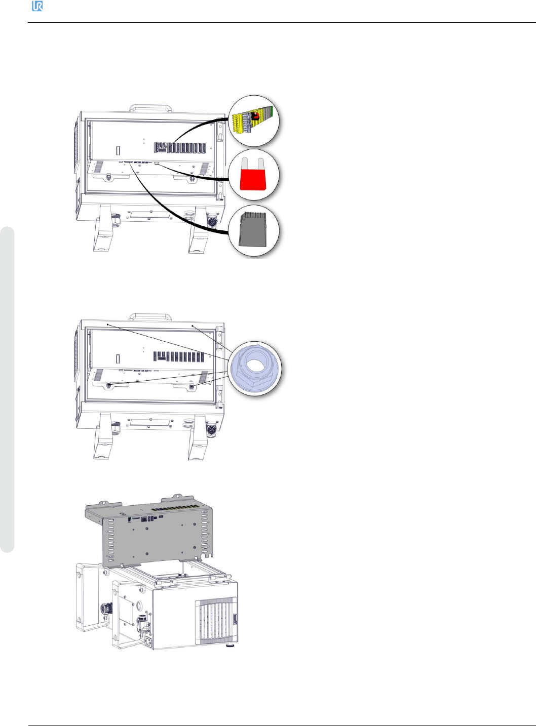 4. 维修和更换零件 优傲 机器人 维修手册 41 维修手册 版权 © 2009 – 2020 优傲机器人公 司版权所有。保留所有权利。 6. 将新的机器人电缆连接 到控制箱连接器上,并扭 转至闭合位置 4.4. 控制箱 4.4.1. 拆卸控制箱 警告 在更换控制箱内的任何 组件之前,控制箱必须完 全断电。 遵循 完整的重启序列 中的前 3 个步骤进行操 作 注意 处理易受静电损坏零件 时要小心谨慎。 参见第 2 节。 处理易受静电放电…